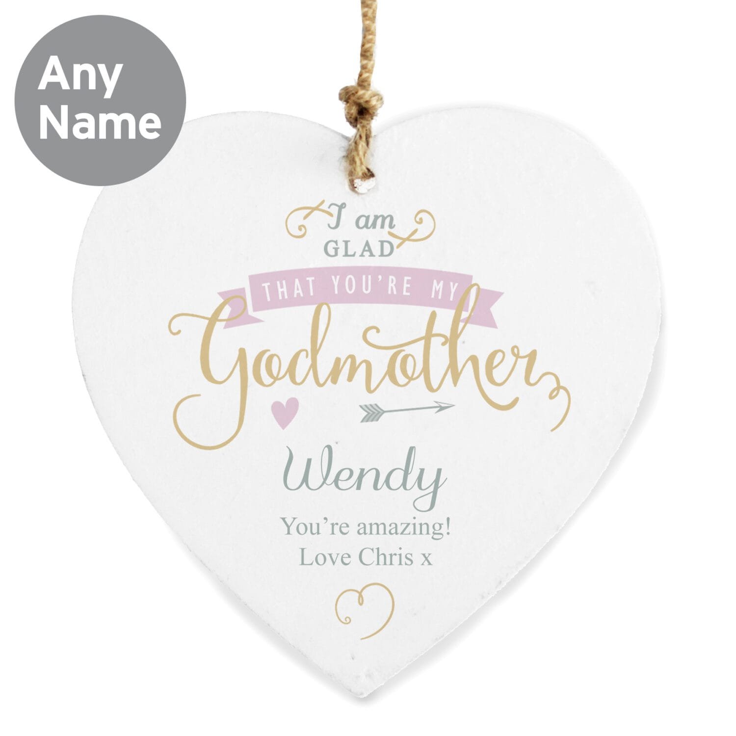 Personalised ‘I Am Glad That You’re My Godmother’ Hanging Wooden Heart Decoration