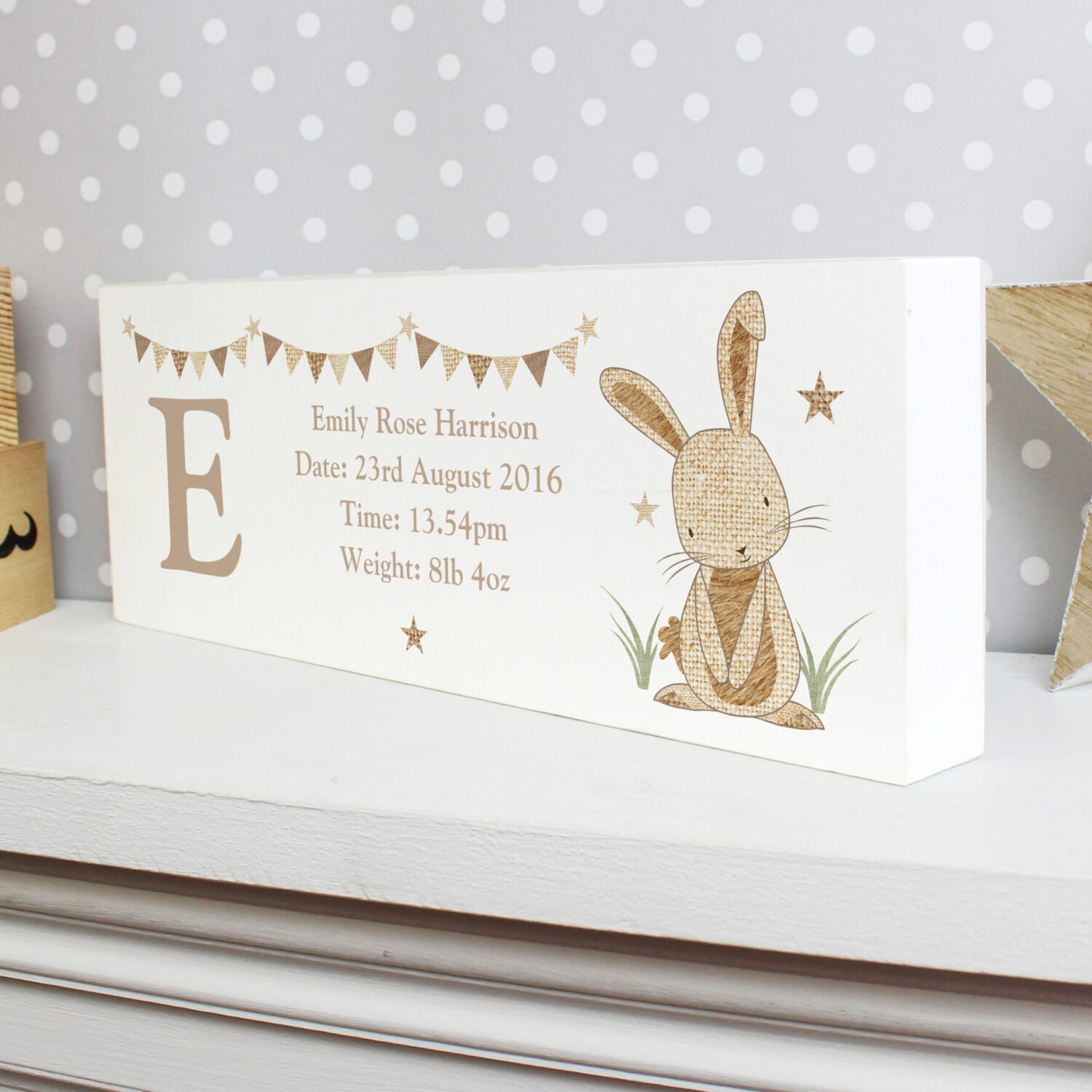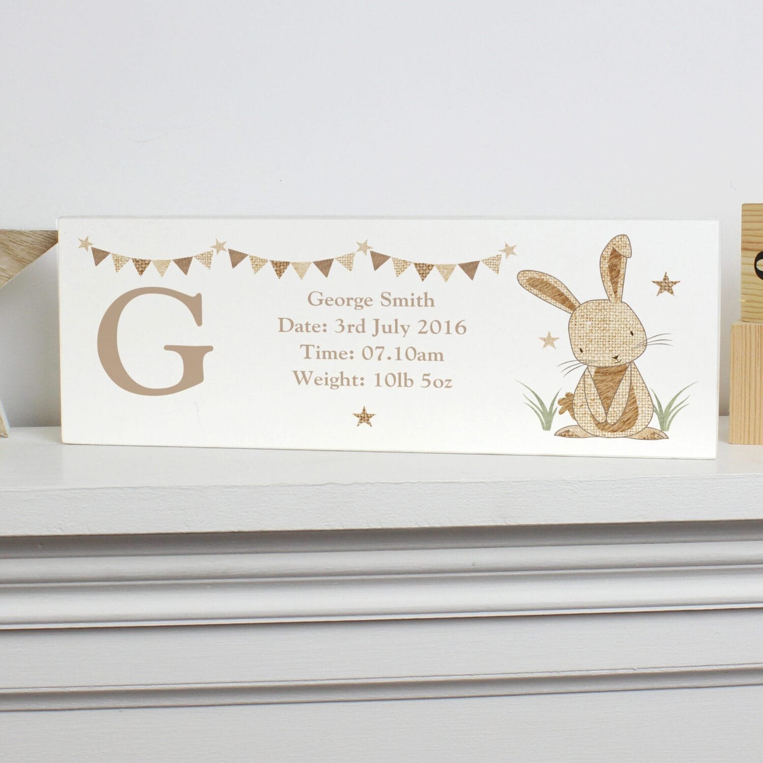 Add a soft, rustic charm to any nursery or child’s room with this Personalised Hessian Rabbit Design Wooden Mantel Decoration. Featuring an adorable bunny illustration and your personalised message, it’s a heart-warming keepsake that’s both decorative and meaningful.