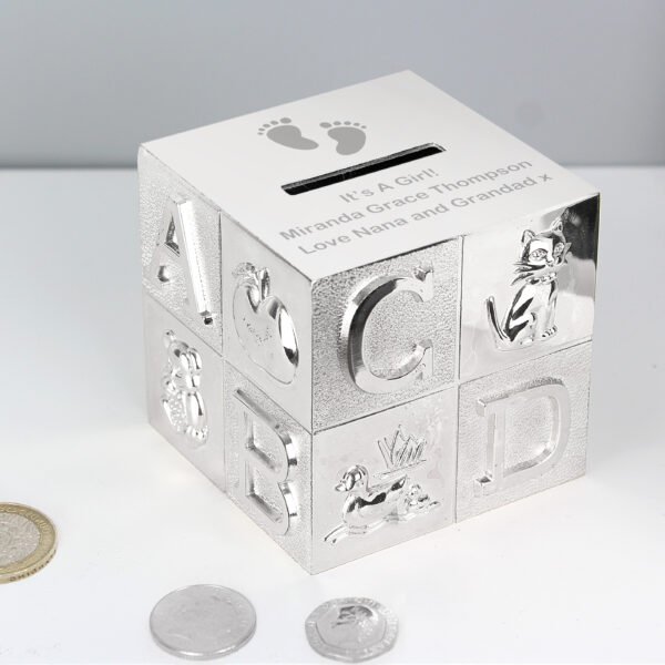 - Classic ABC Block Design: A stylish silver-plated money box featuring traditional A, B, C blocks, perfect for children’s gifts.