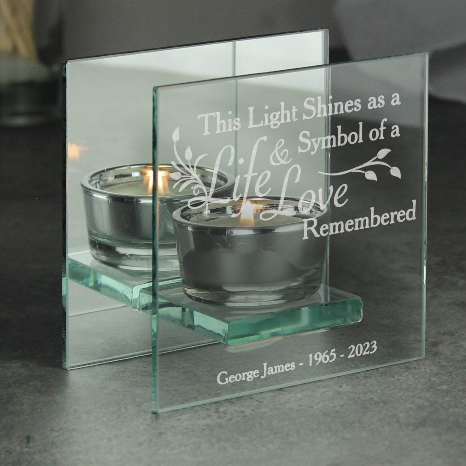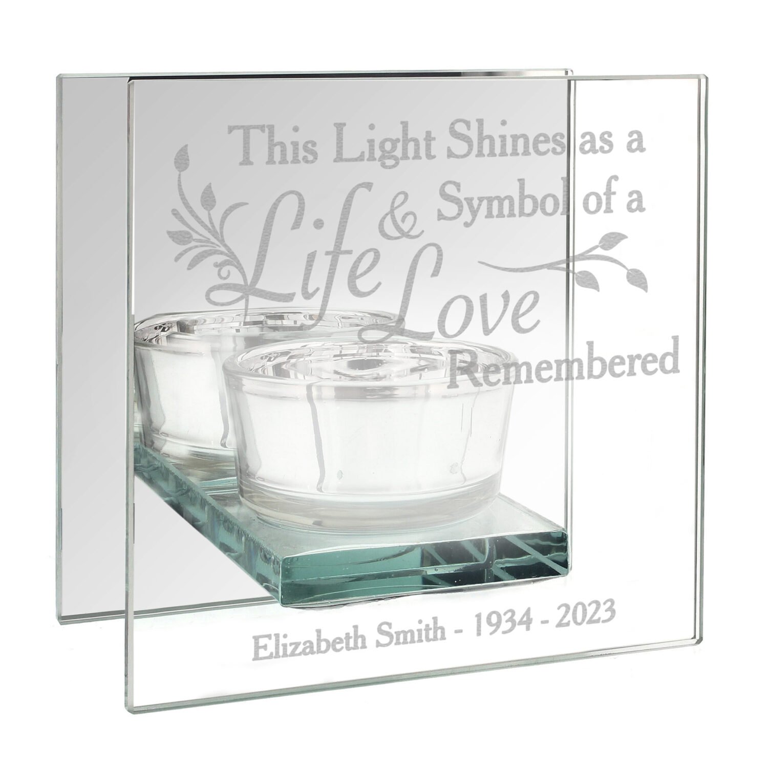 Personalised ‘Life & Love Remembered’ Memorial Mirrored Glass Tea Light Candle Holder