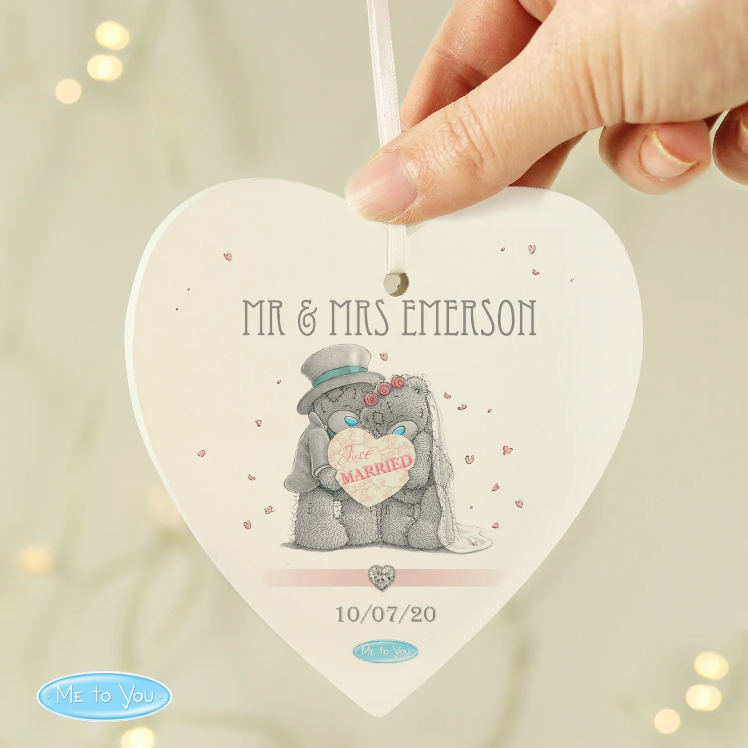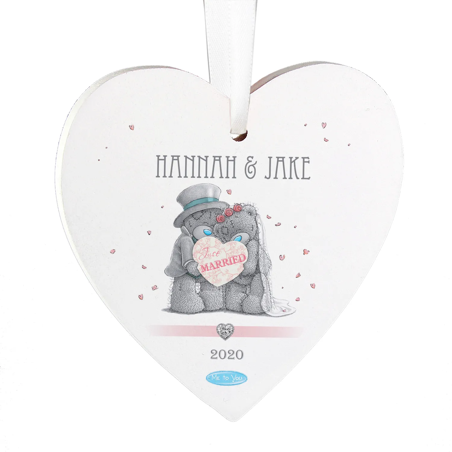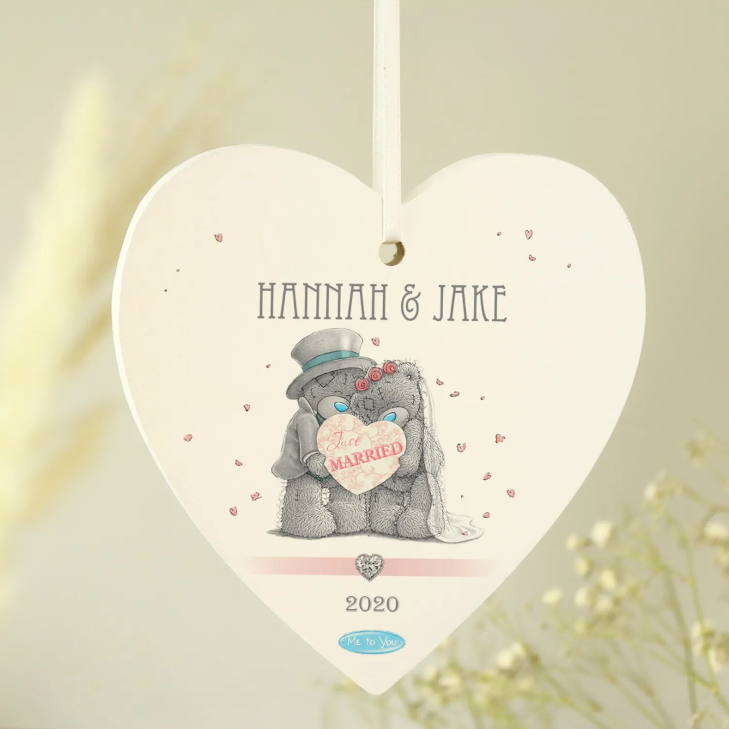 Celebrate the joy of a special day with this charming Personalised Me to You Wedding Couple Hanging Wooden Heart Decoration. Featuring the iconic Tatty Teddy couple and the fixed phrase “Just Married”, this beautifully crafted decoration is a heartfelt keepsake for newlyweds.