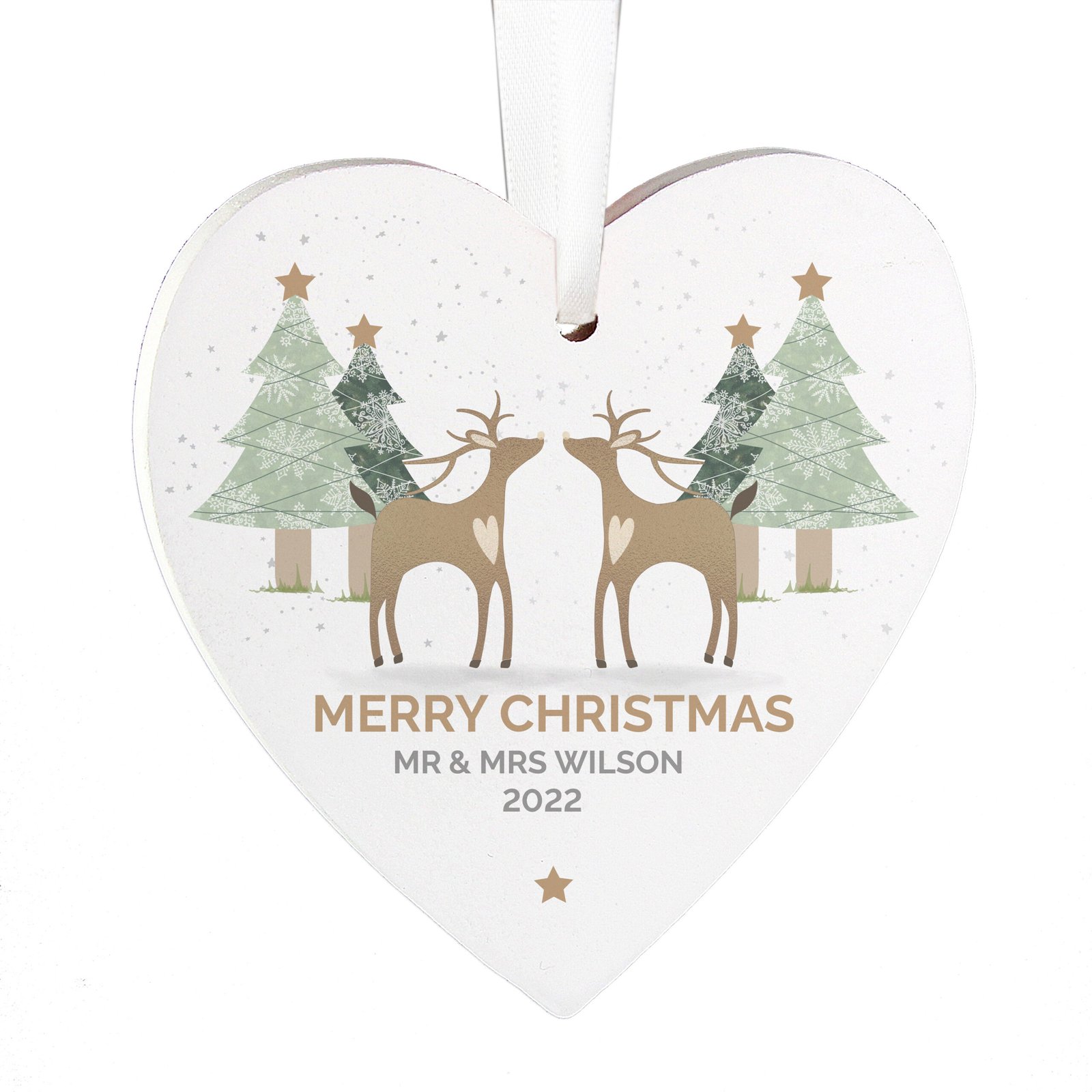 Personalised ‘Merry Christmas’ Reindeer Couple Hanging Wooden Heart Decoration