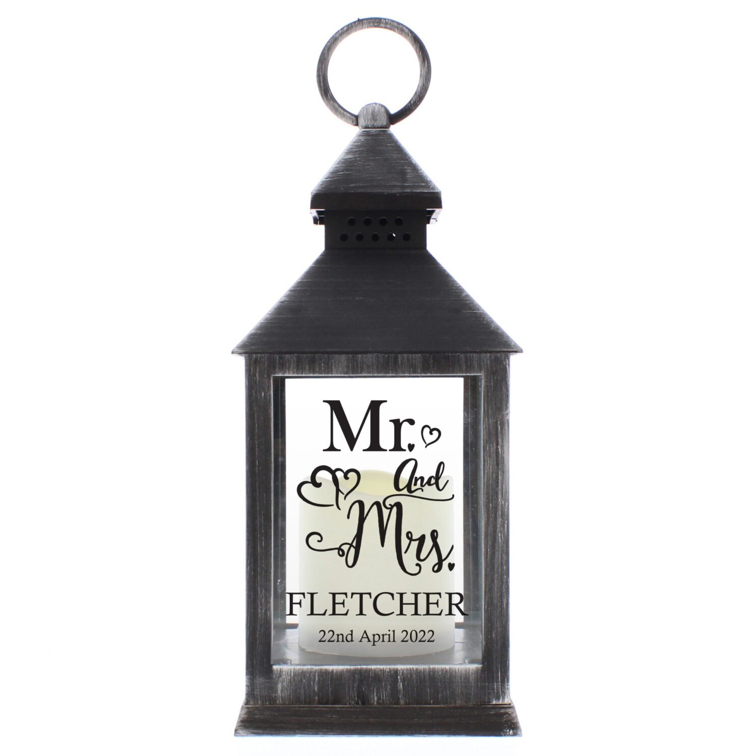 Personalised ‘Mr and Mrs’ Hearts Design Rustic Black Plastic Light-up Lantern
