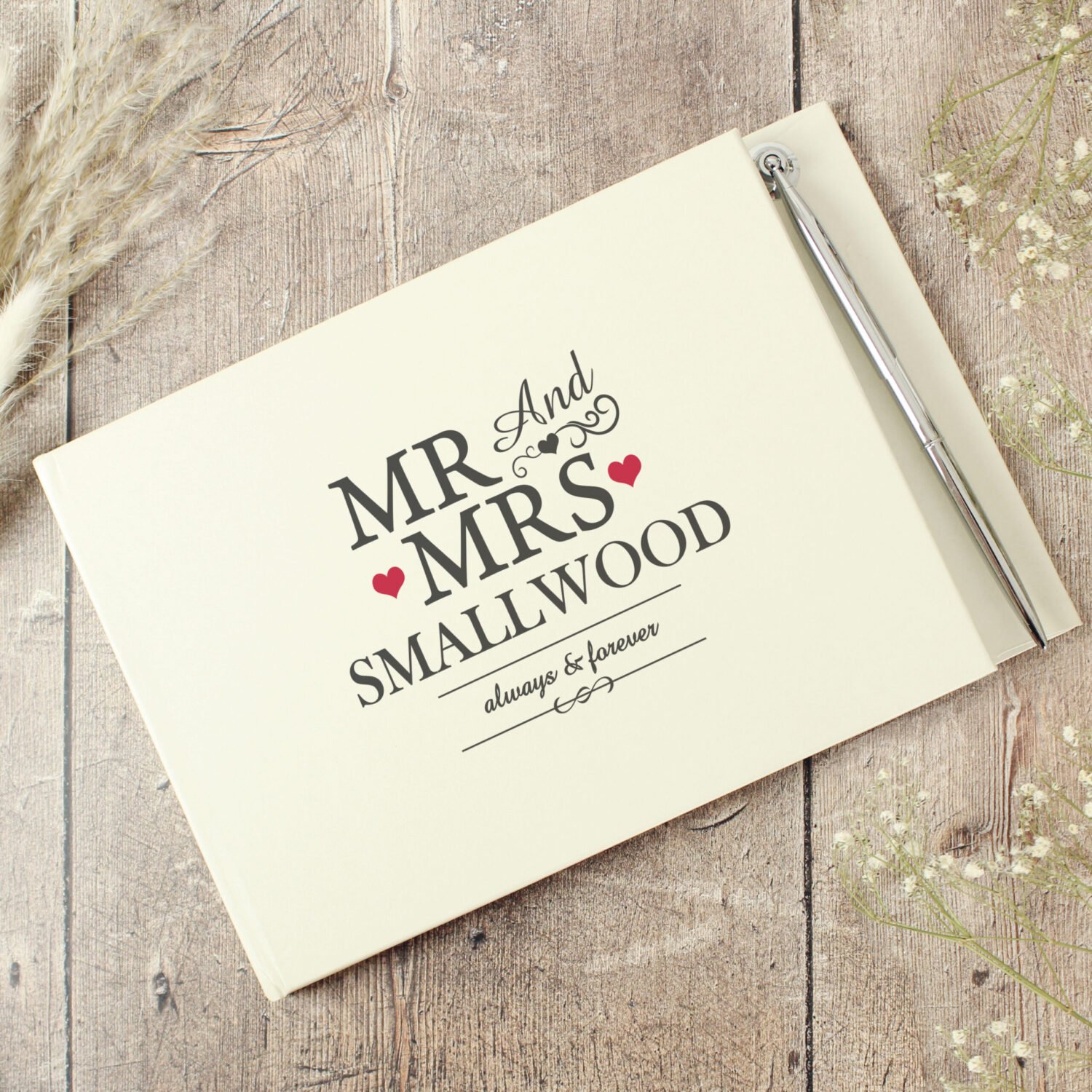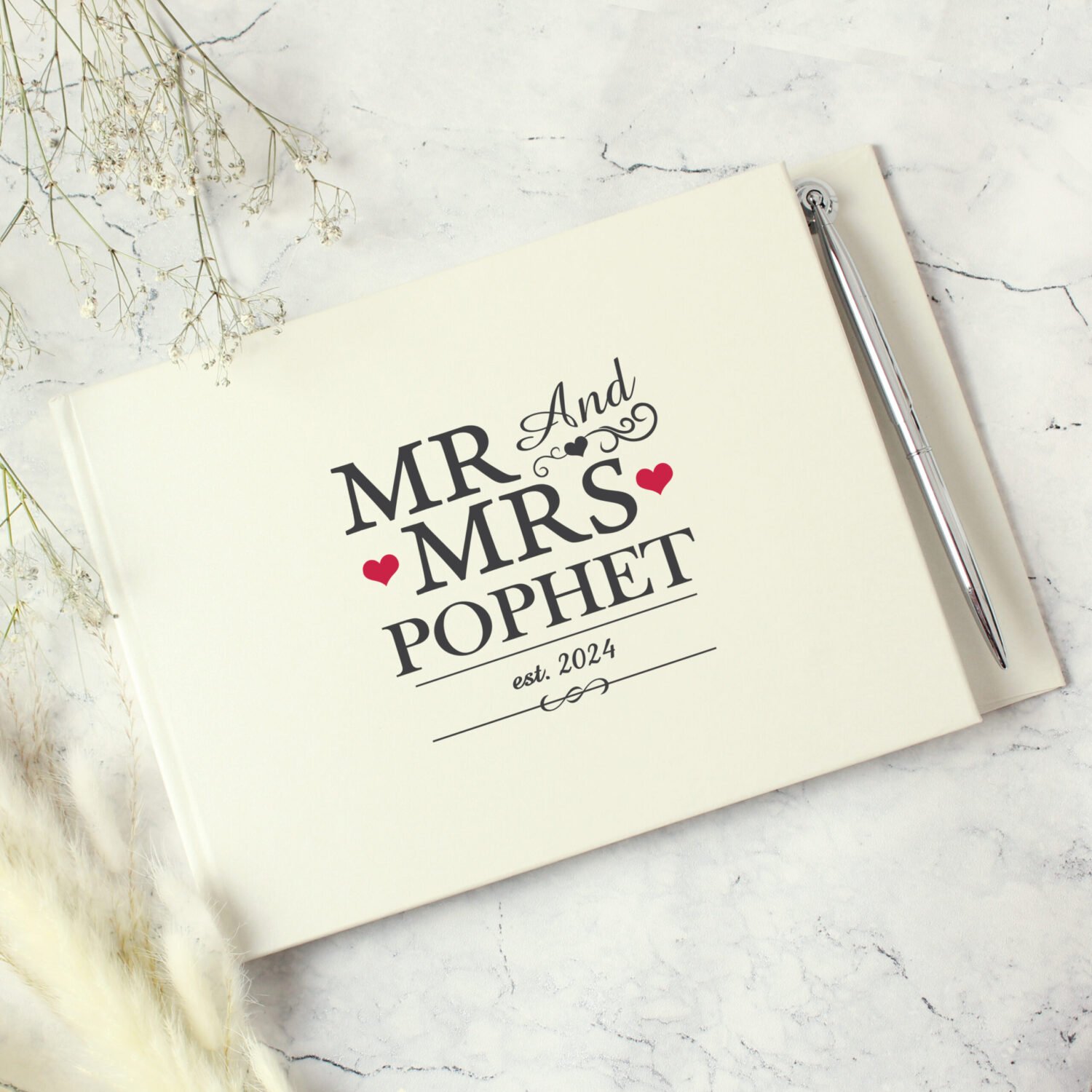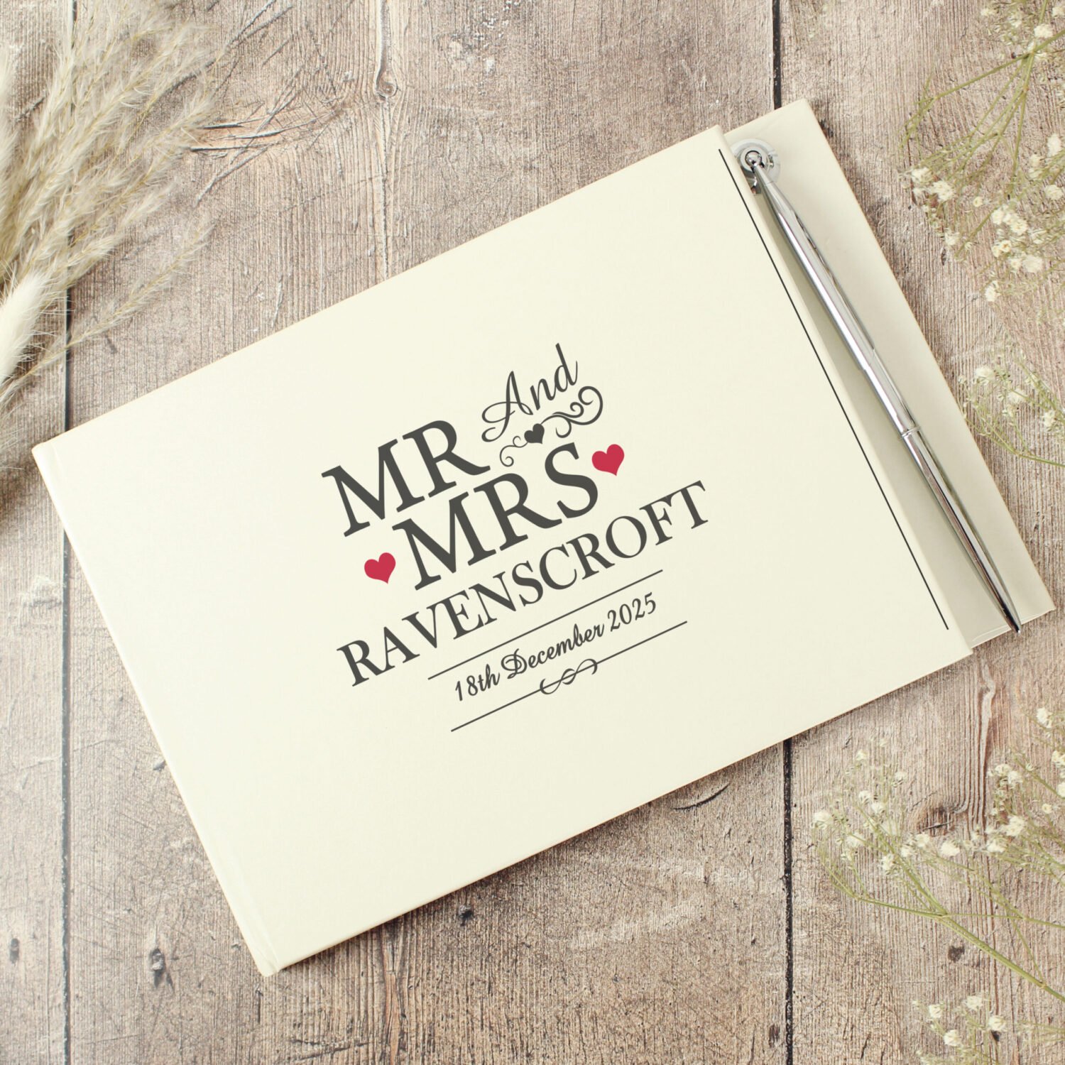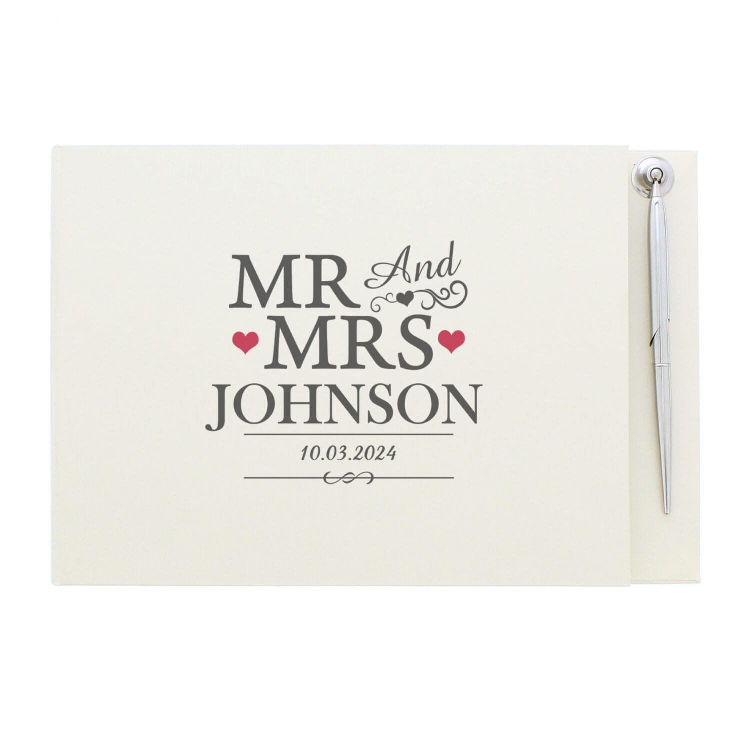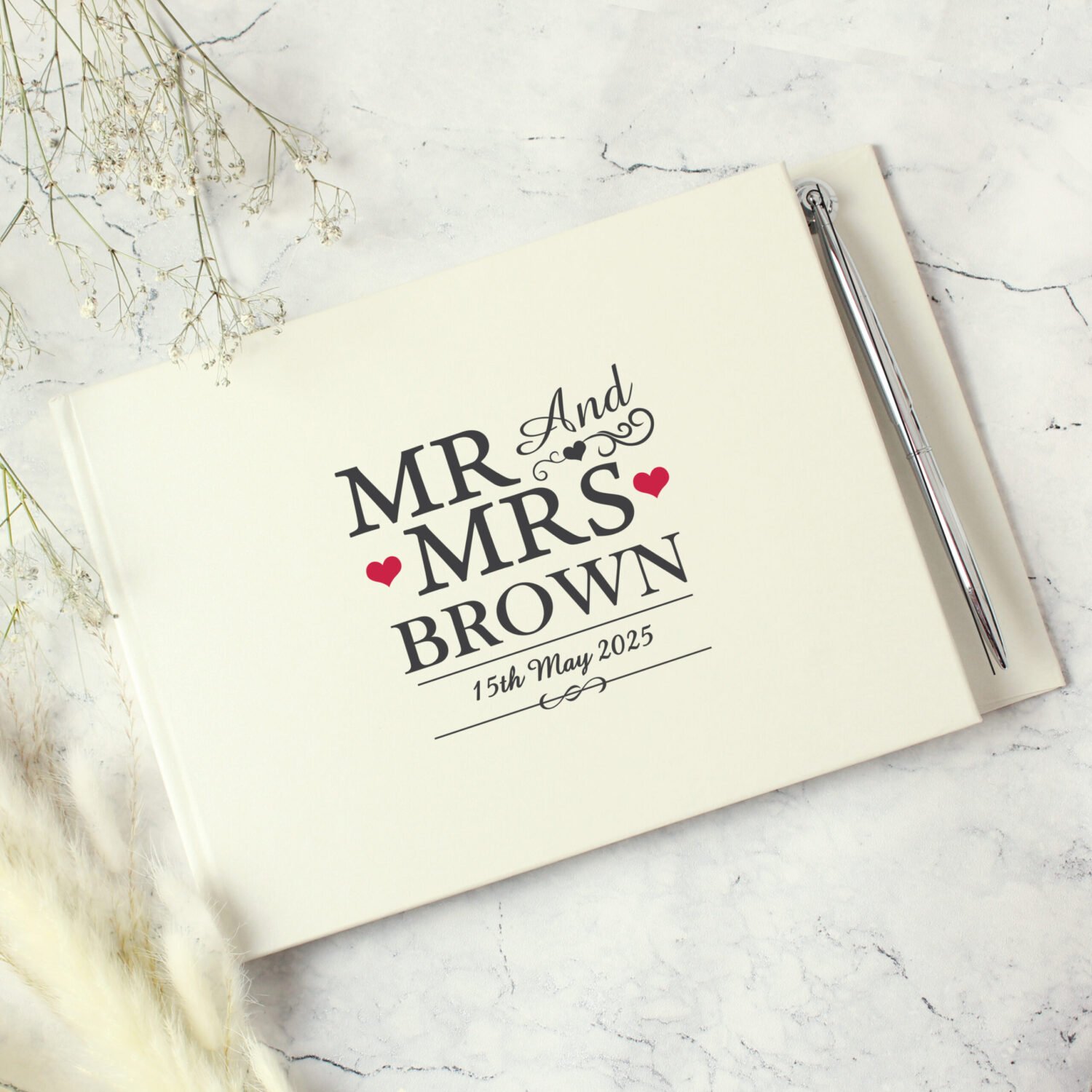 Personalised ‘Mr And Mrs’ Hearts Motif Hardback Guest Book & Pen