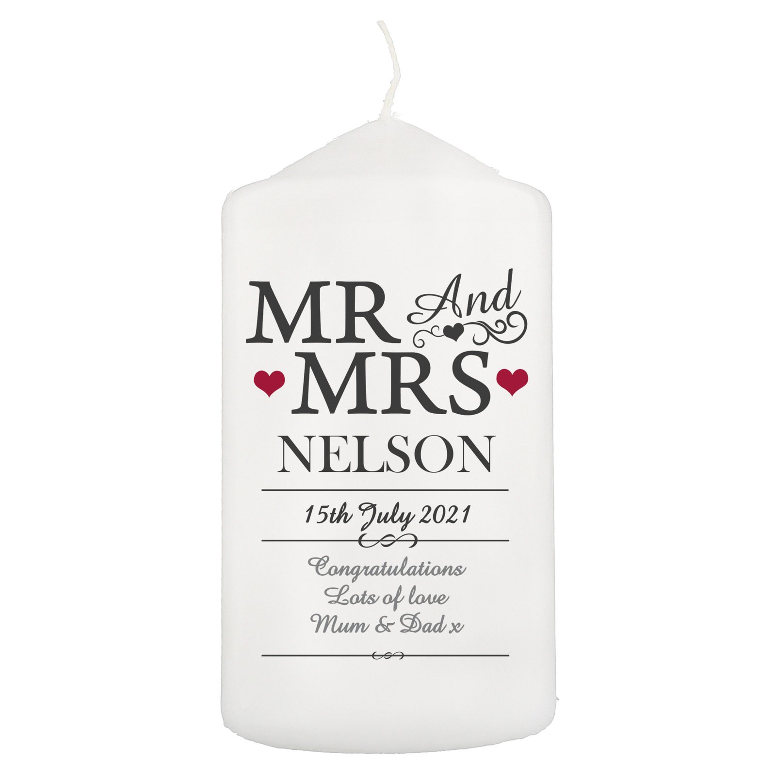 Personalised ‘Mr And Mrs’ Hearts Motif Pillar Candle