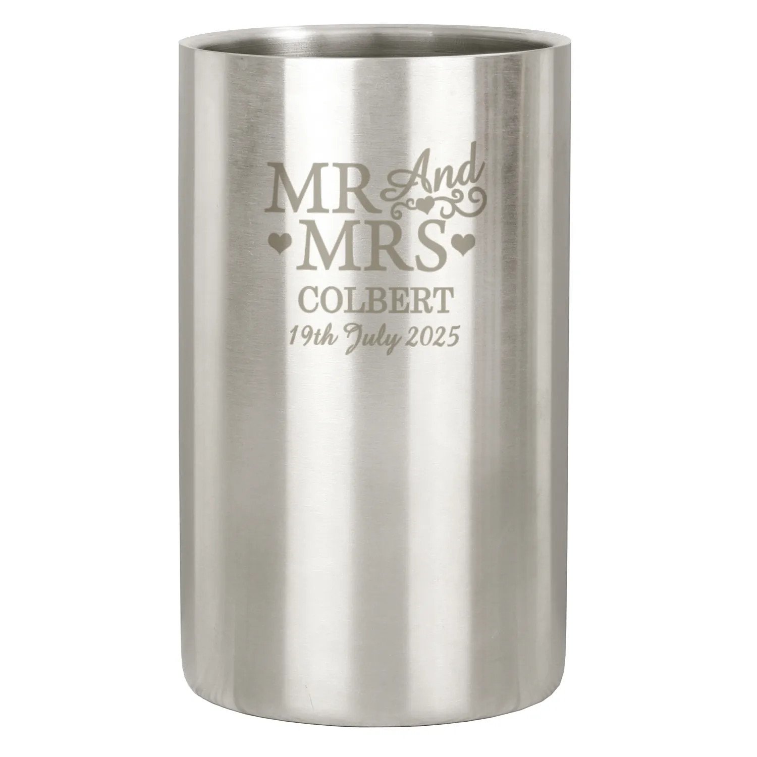 Add a sophisticated and romantic touch to any celebration with this elegant brushed stainless steel wine cooler. Featuring a charming hearts motif and the fixed wording “Mr And Mrs”, this stylish cooler can be personalised with a surname and date—making it a perfect keepsake for newlyweds or anniversaries.