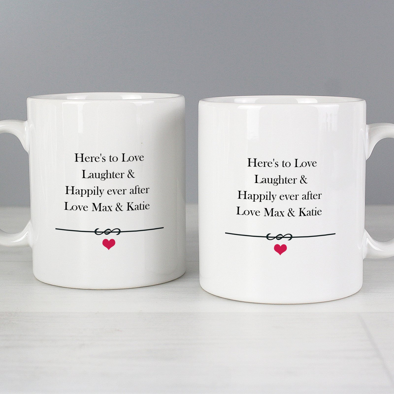 - Both mugs feature the surname and date on the front and your custom message on the reverse