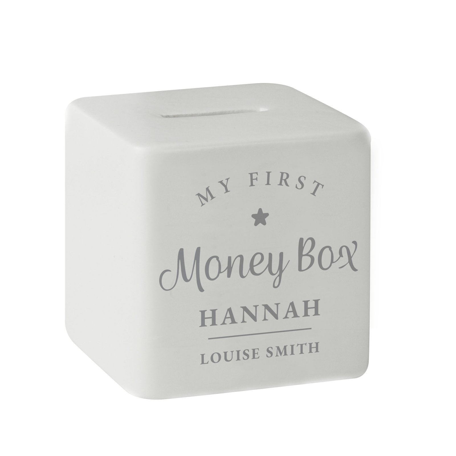 Featuring the fixed text “My First Money Box”, this sweet design can be personalised with your own text to create a truly unique memento that parents and children alike will treasure for years to come.