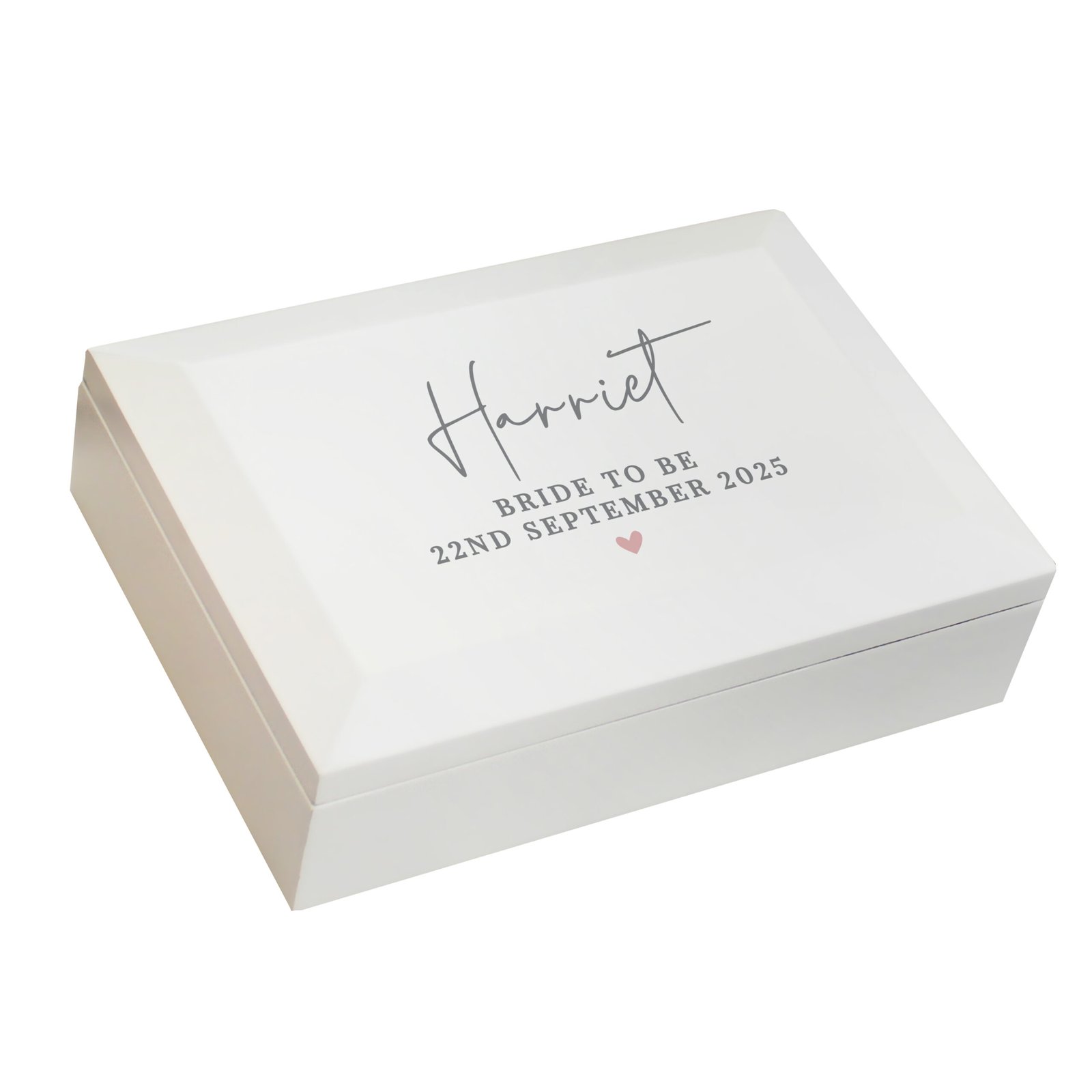 Celebrate a special occasion with our Personalised Name & Message Heart Motif White Wooden Jewellery Box – a beautifully crafted keepsake designed to store your most precious treasures in style. Combining timeless elegance with heartfelt customisation, this jewellery box makes a truly meaningful gift for someone special or a charming addition to your own dressing table.