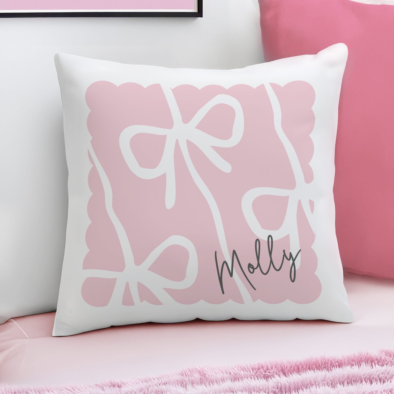Bring a touch of personality and charm to any space with the Personalised Name Only Pink Bow Design Filled Cushion — a cute and comfy keepsake that combines style, softness, and sentiment.