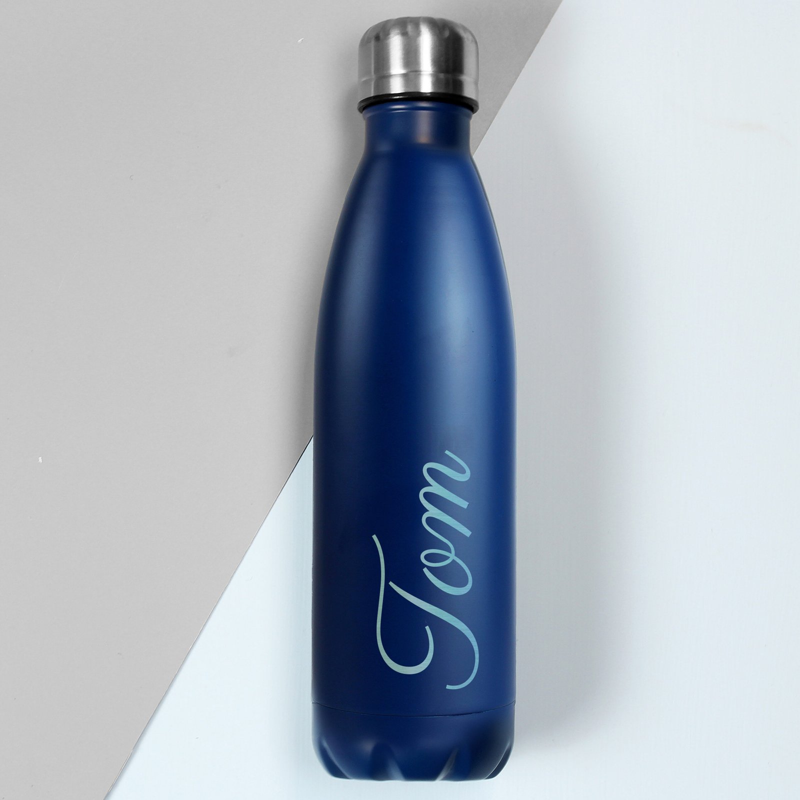 Stay hydrated in style with this sleek blue stainless steel insulated drinks bottle, personalised with your name in an elegant script font. Perfect for both hot and cold beverages, this 500ml double-wall vacuum bottle is a practical and eco-friendly choice for everyday use.