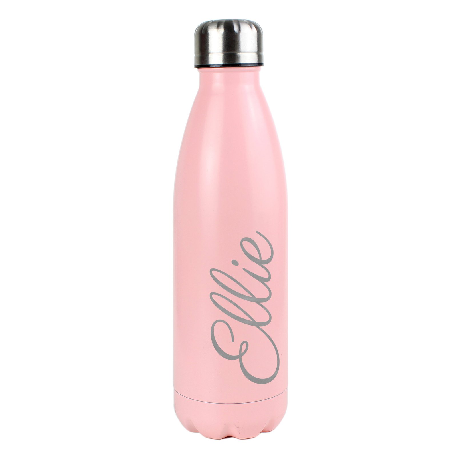 Stay hydrated in style with this sleek pink stainless steel insulated drinks bottle, personalised with your name in an elegant script font. Perfect for both hot and cold beverages, this 500ml double-wall vacuum bottle is a practical and eco-friendly choice for everyday use.