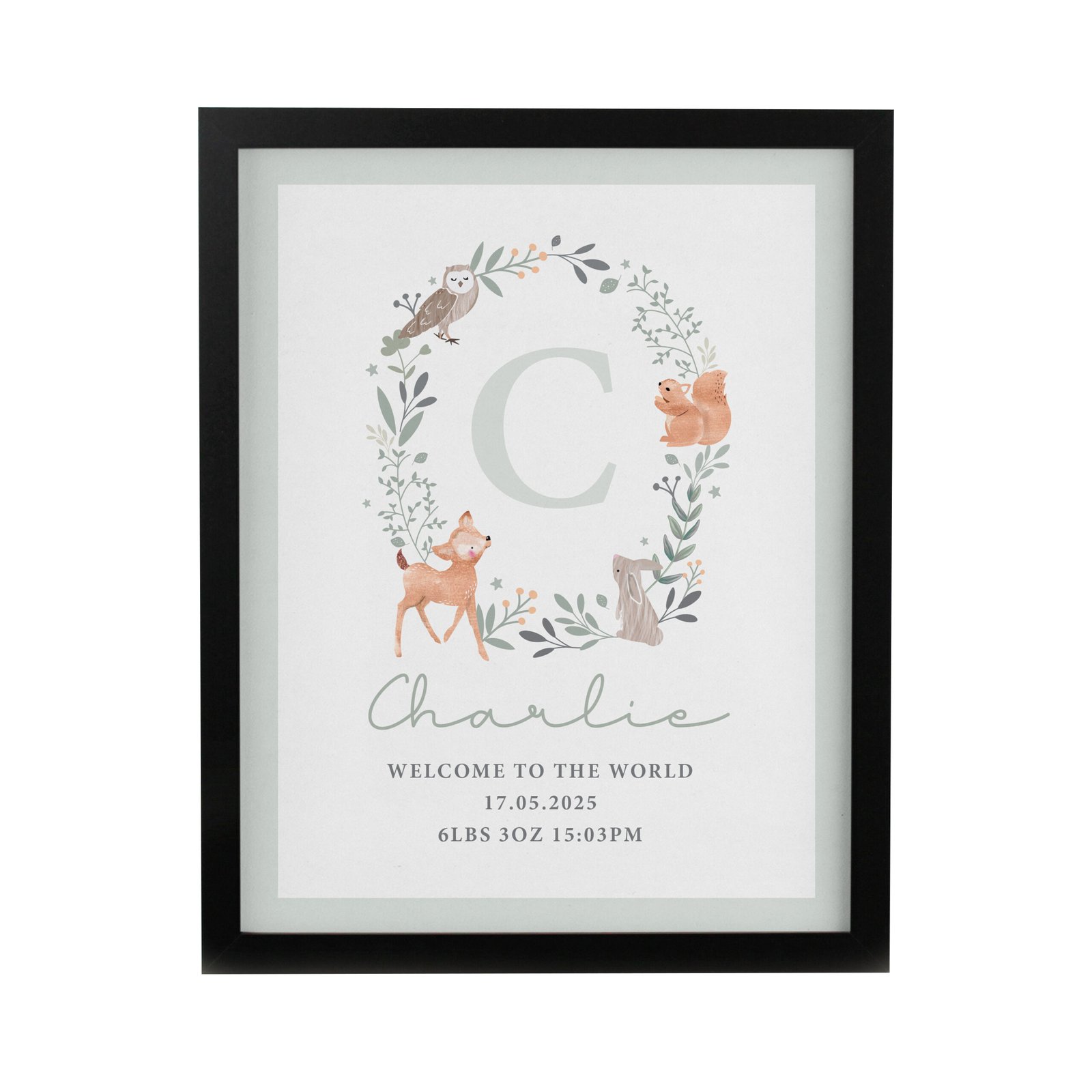Welcome your little one to the world with our Personalised New Baby Initial Woodland Animals Framed Poster — a charming and beautifully designed print featuring adorable woodland creatures. This delightful keepsake makes the perfect addition to any nursery or child’s bedroom, capturing the warmth and wonder of early memories.