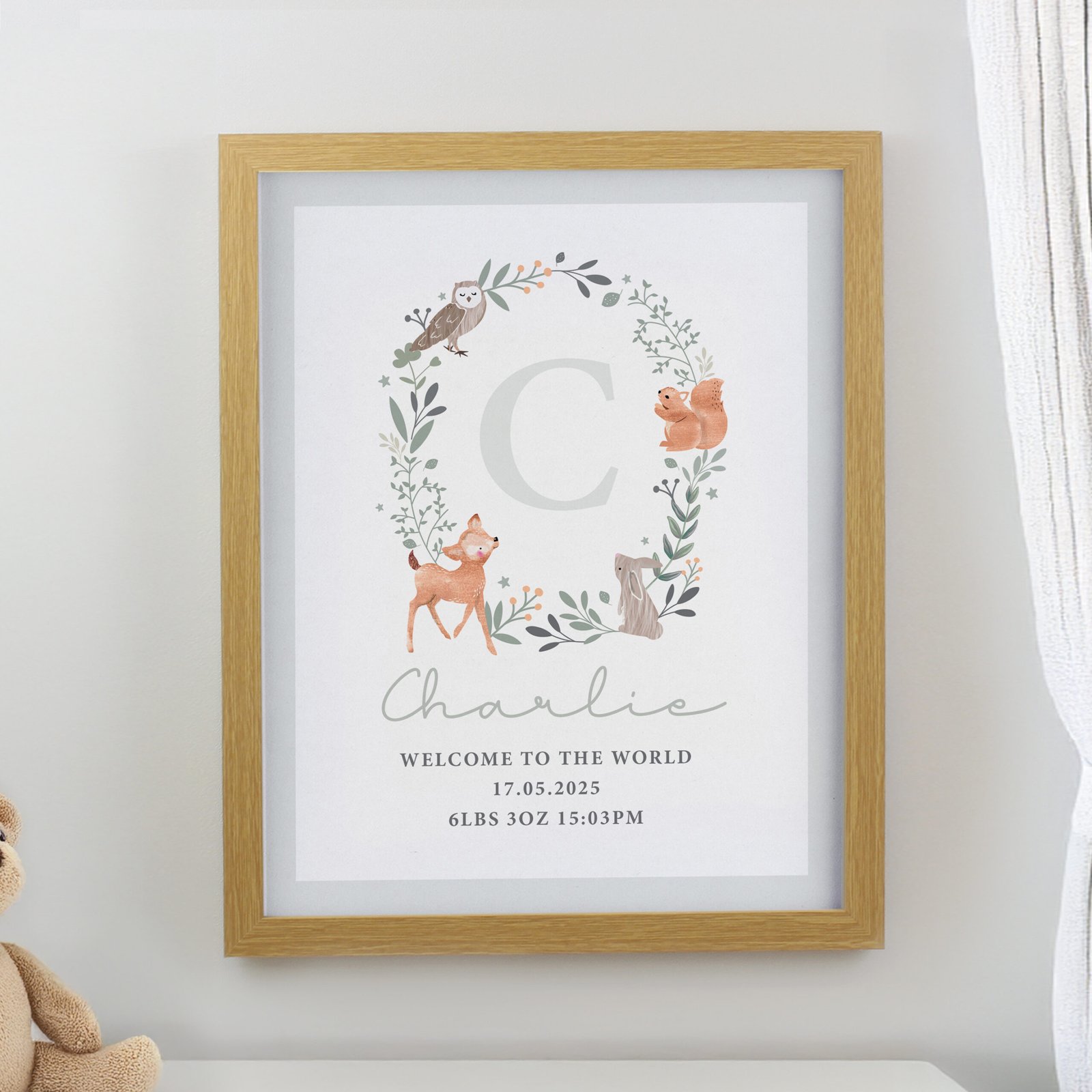 Personalised New Baby Initial Woodland Animals Design Oak Framed Poster