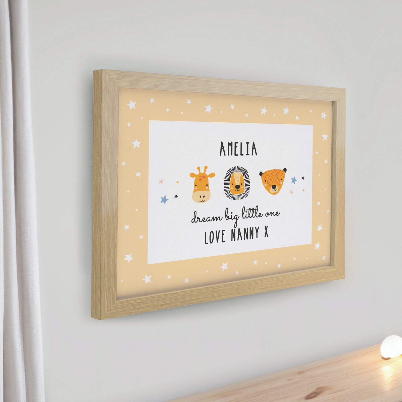 Featuring adorable safari-style animals in a contemporary Scandi design, this framed artwork is the perfect keepsake to celebrate a precious new life.