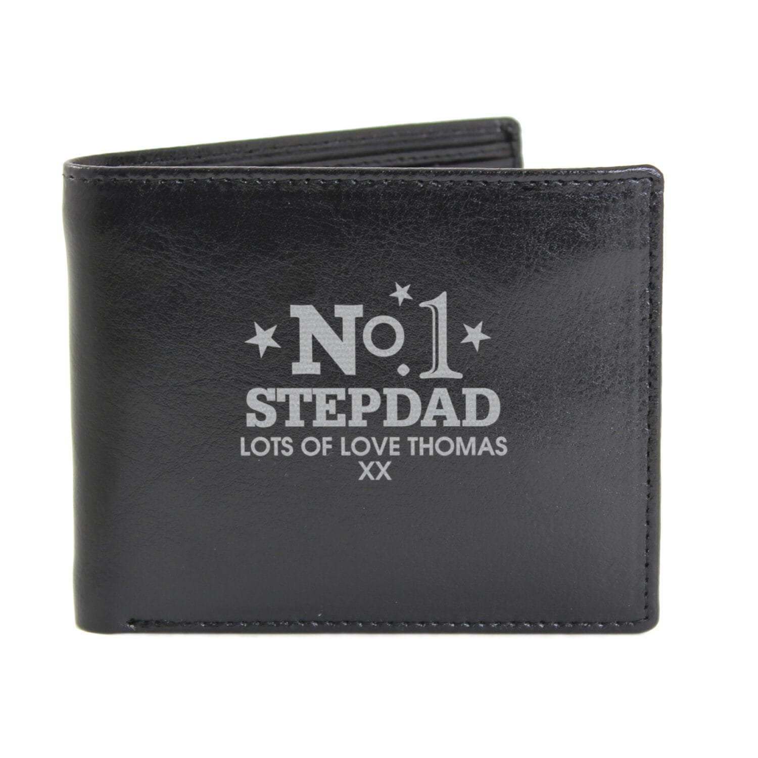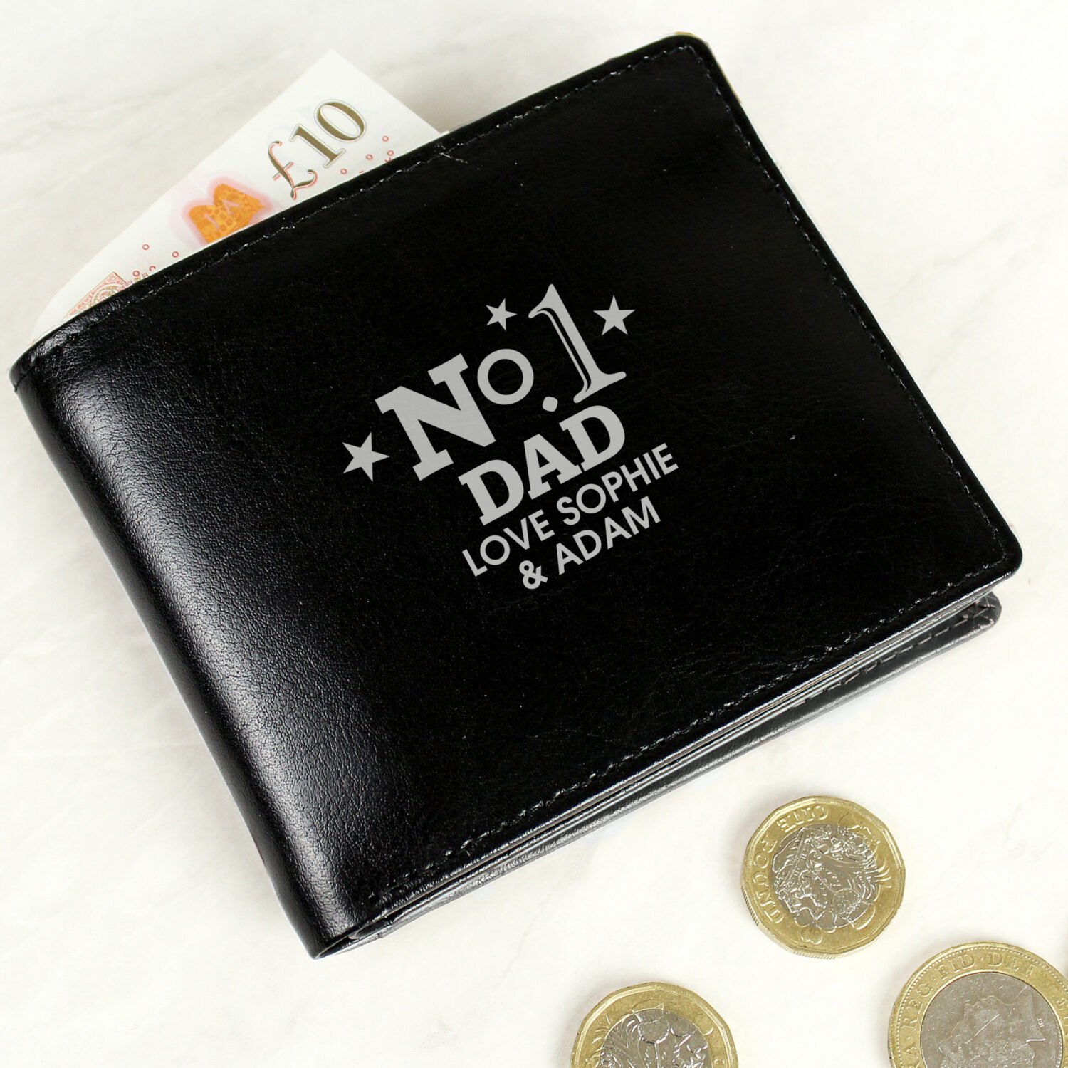 Celebrate someone special with this stylish and practical personalised black leather wallet. Featuring a bold ‘No.1’ design with a subtle stars motif, this wallet is the perfect way to show appreciation for dads, partners, friends, or anyone who deserves top spot.