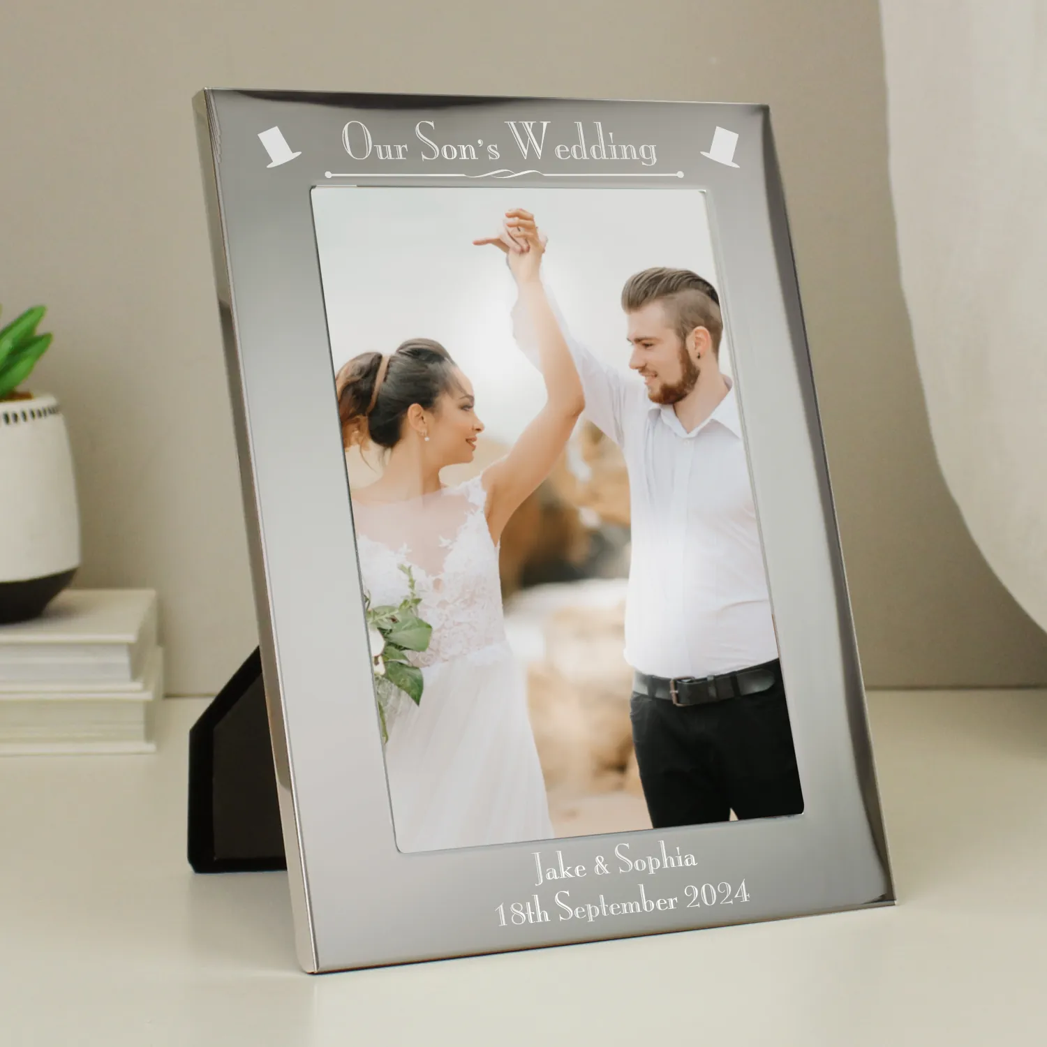 Personalised ‘Our Son’s Wedding’ Top Hat Motif 5×7 Portrait Silver Aluminium Photo Frame