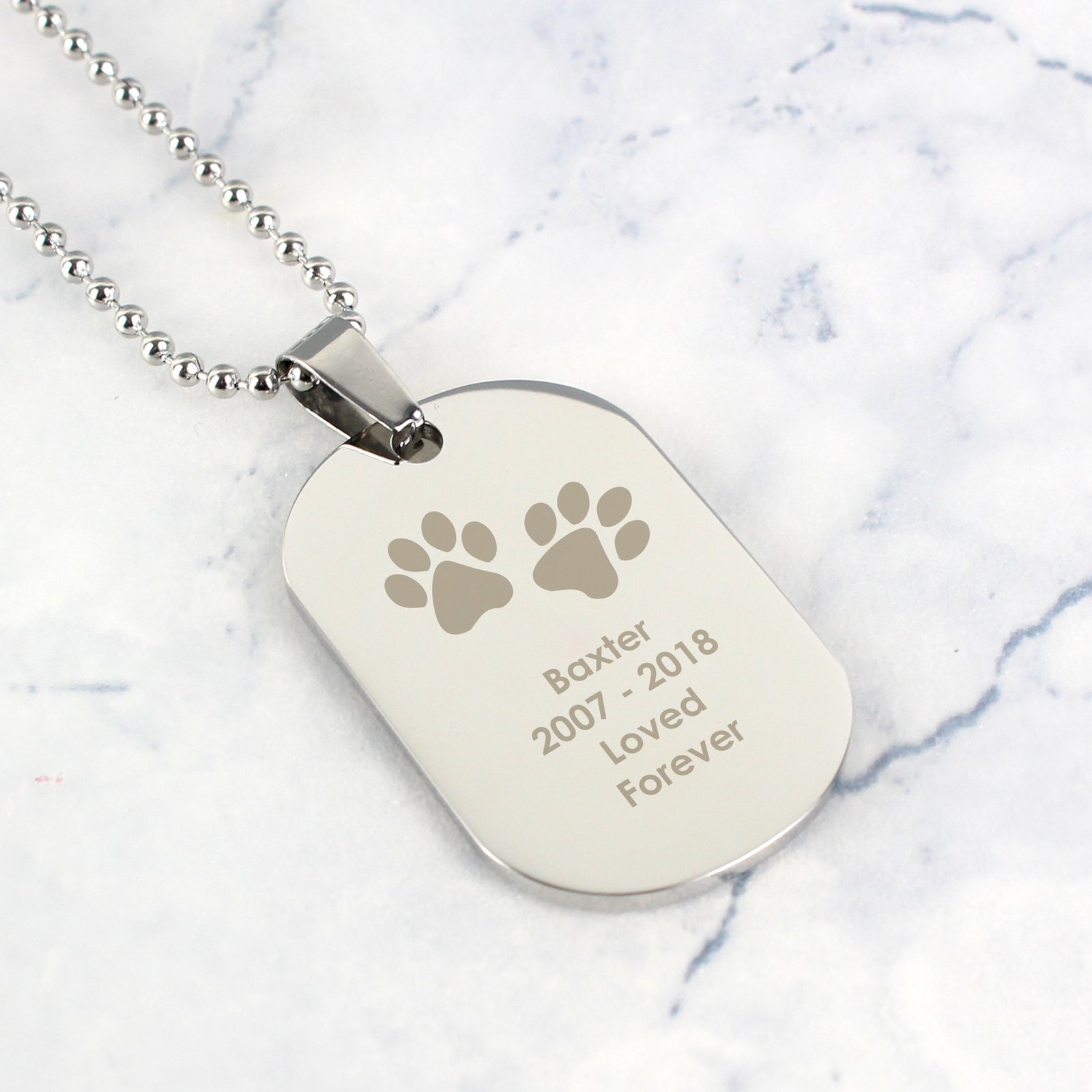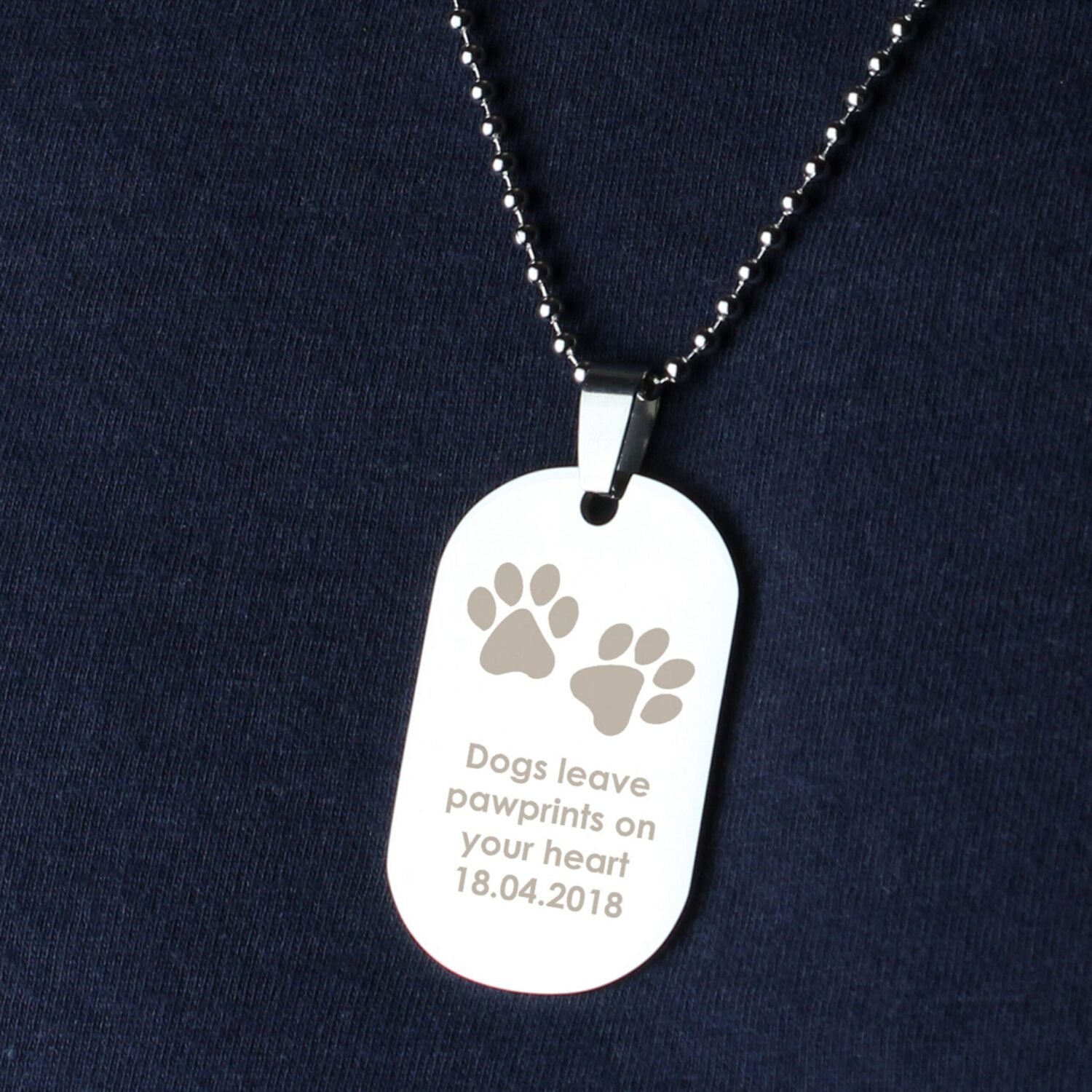 Keep the memory of a beloved pet close to your heart with this Personalised Paw Prints Motif Dog Tag Necklace. Crafted from durable stainless steel, this stylish and sentimental accessory is a touching tribute to a cherished companion.