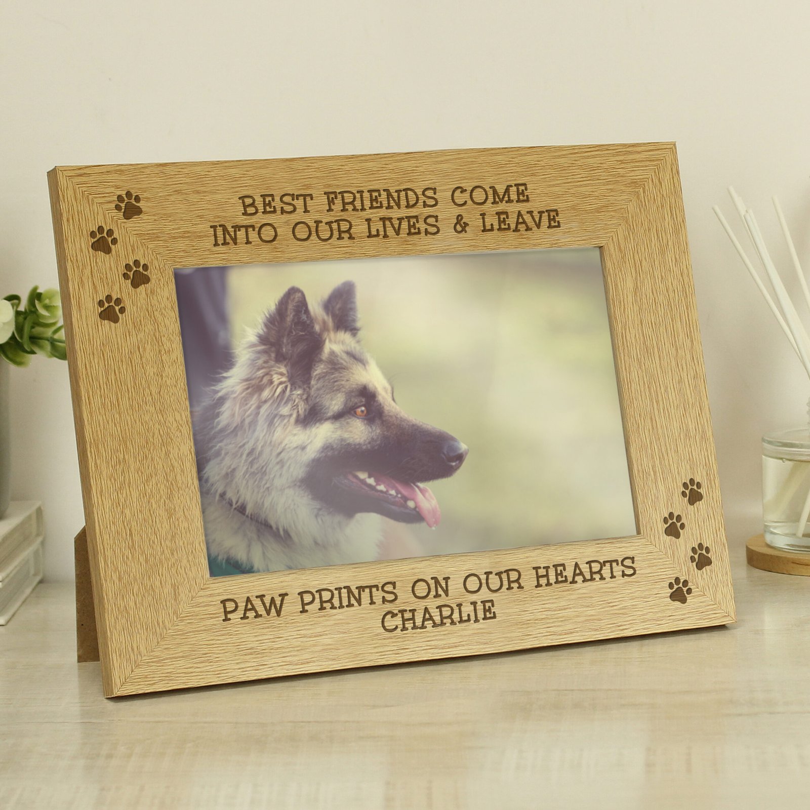 Personalised Pet Pawprints Motif 6×4 Landscape Oak Finish Photo Frame