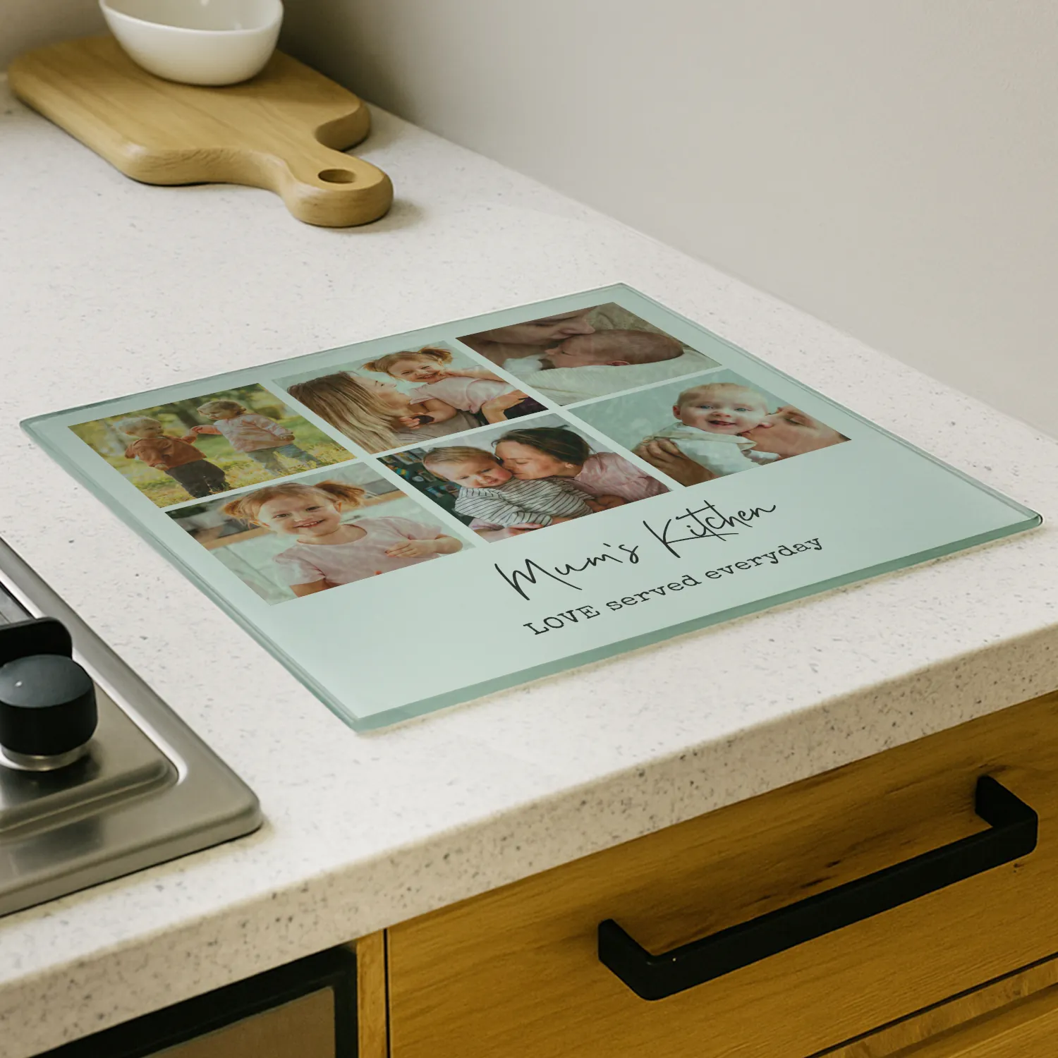 Upgrade your kitchen with a stylish and meaningful touch using this Personalised Multi Photo Upload Glass Chopping Board. Combining practicality with beautiful custom design, this versatile kitchen accessory makes a thoughtful gift and a standout addition to any home.