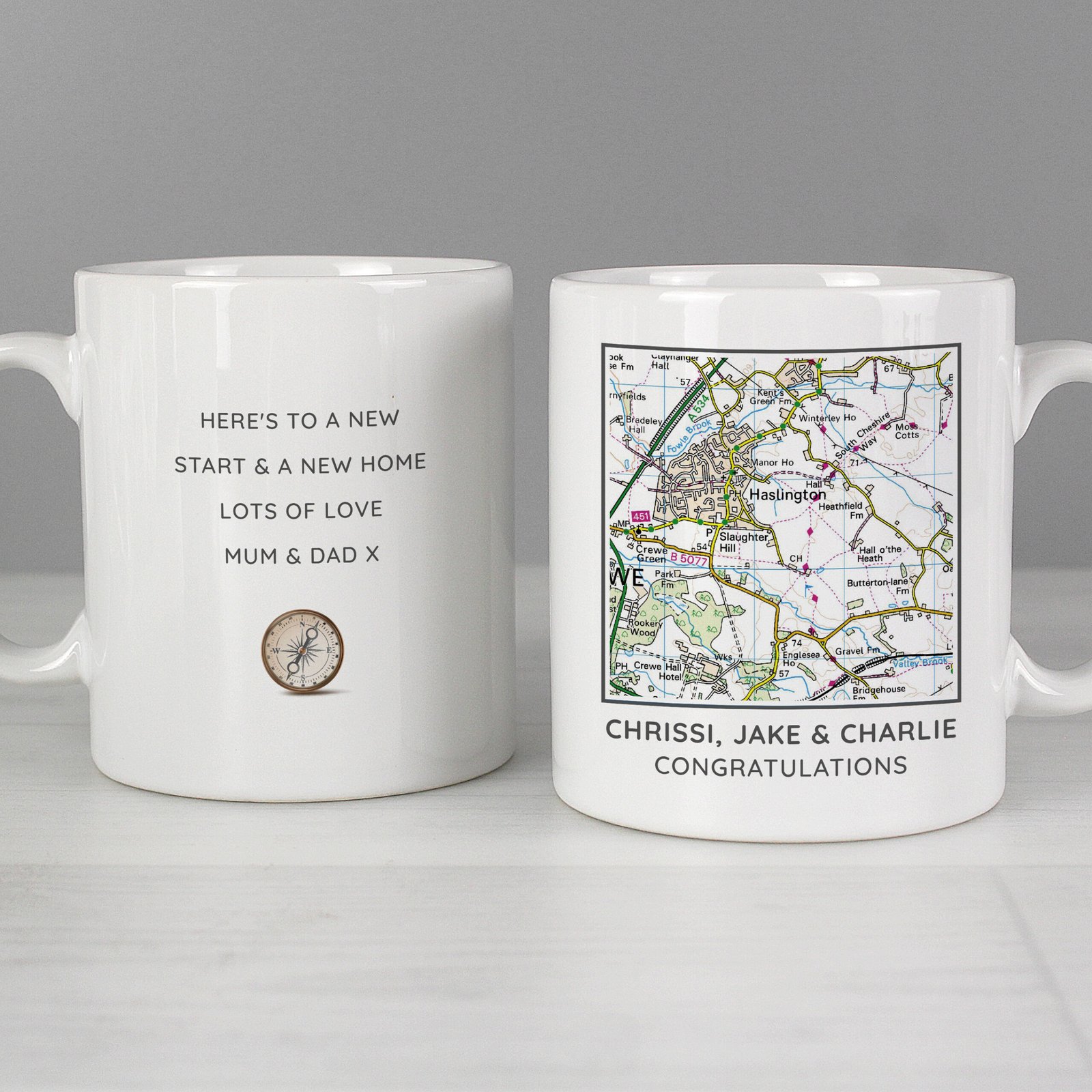Featuring a detailed Ordnance Survey map centred around your chosen UK postcode, this elegant ceramic mug is complete with a compass-style motif and personal text both front and back. Whether it marks the location of a first home, a wedding venue, or a treasured memory, it’s a lasting keepsake for someone special.