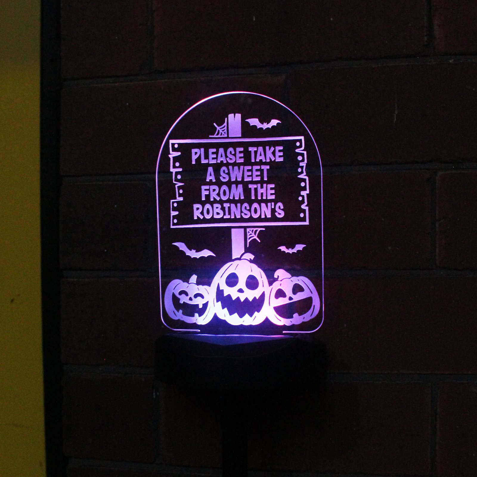 🕯️ A fun way to brighten up your spooky celebrations, this personalised Pumpkin Patch solar light makes a unique decoration for Halloween parties, trick-or-treat displays, or even as a thoughtful seasonal gift.