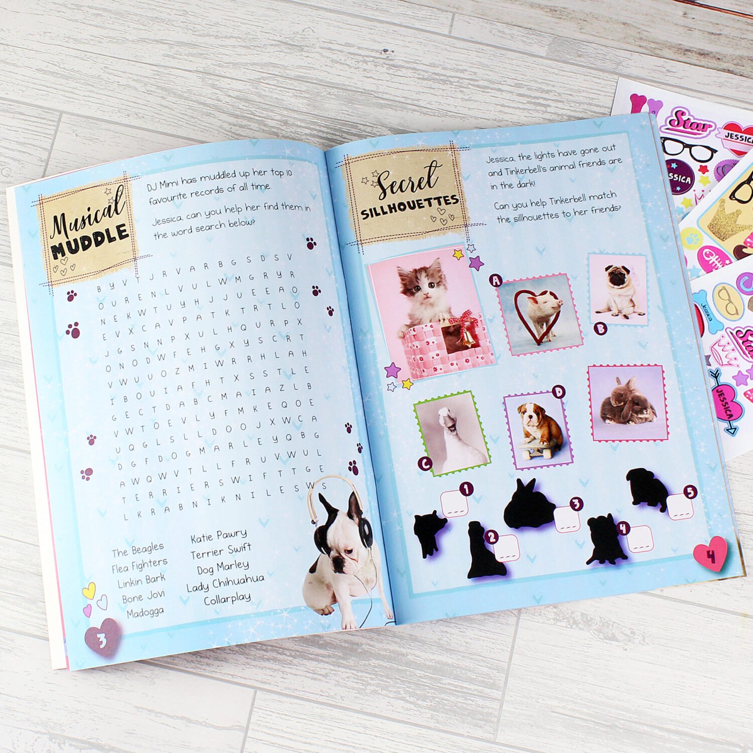 Name (up to 12 characters) appears on the front cover, throughout the activity pages, and on selected stickers.