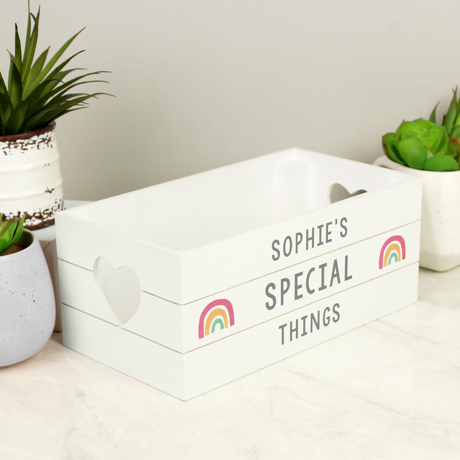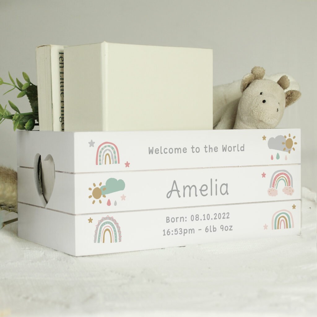 Personalised Rainbow Motif Small White Wooden Storage Crate