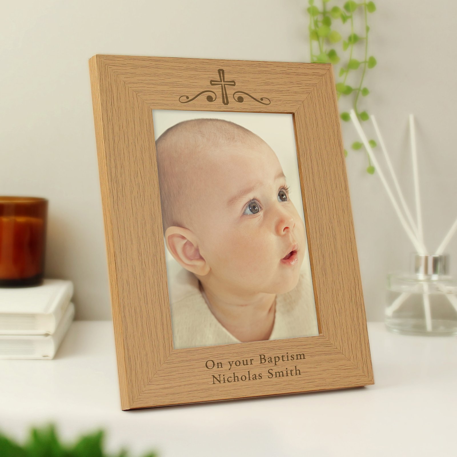 Capture and display the memories of a cherished religious occasion with our Personalised Religious Cross & Swirl Design Oak Finish Photo Frame. With its elegant detailing and warm oak veneer, this timeless frame is perfect for commemorating Baptisms, Christenings, First Holy Communions, or Confirmations.