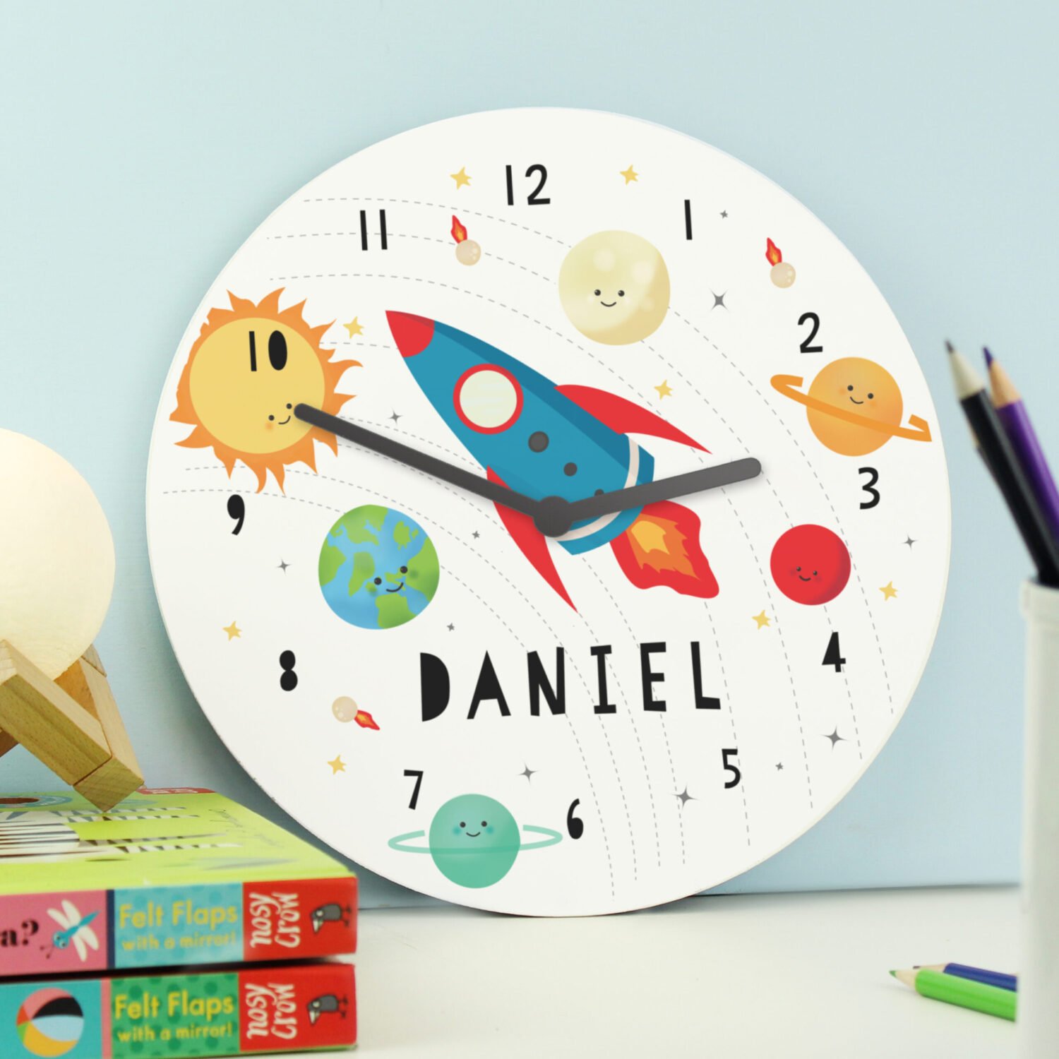 Blast off into timekeeping with this Personalised Rocket in Space Round Wooden Wall Clock! Featuring a fun solar system design and bold rocket illustration, it’s the perfect addition to any young space enthusiast’s bedroom or playroom.