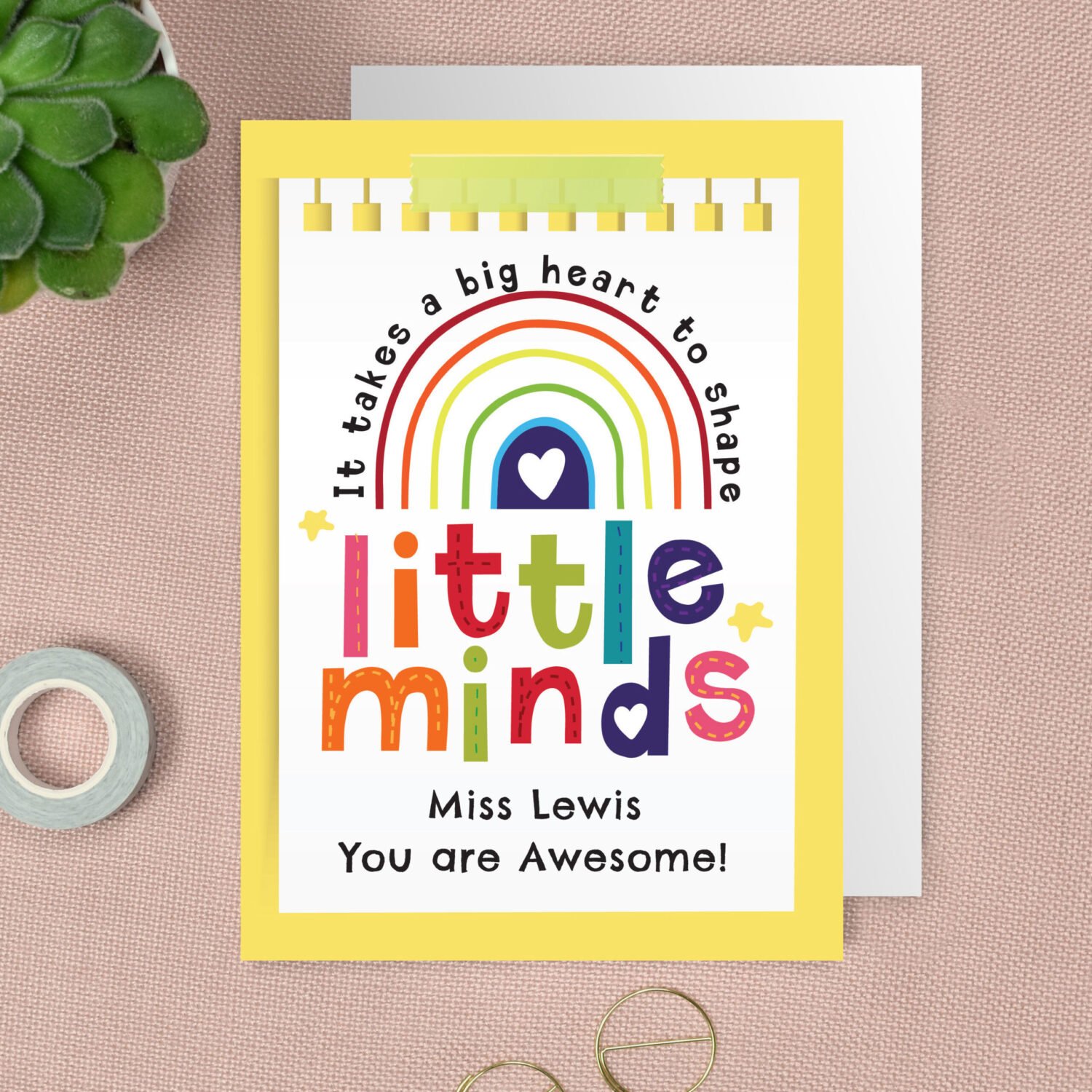 Show your appreciation for a special teacher or childminder with this thoughtful personalised greeting card. Featuring a heartfelt design and the inspiring message “It takes a big heart to shape little minds”, this card is the perfect way to convey your gratitude.