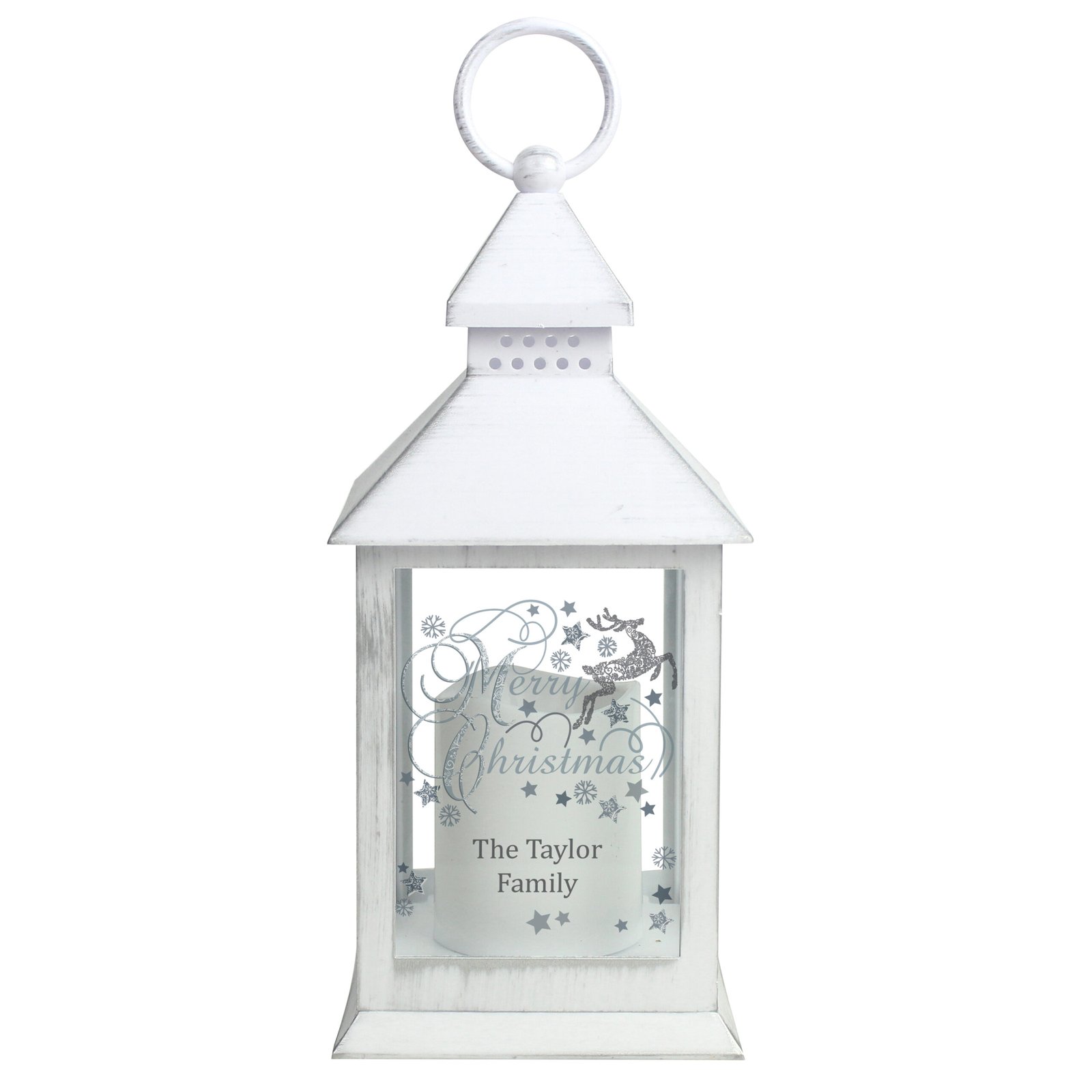 Personalised Silver Reindeer Design ‘Merry Christmas’ Rustic White Plastic Light-up Lantern
