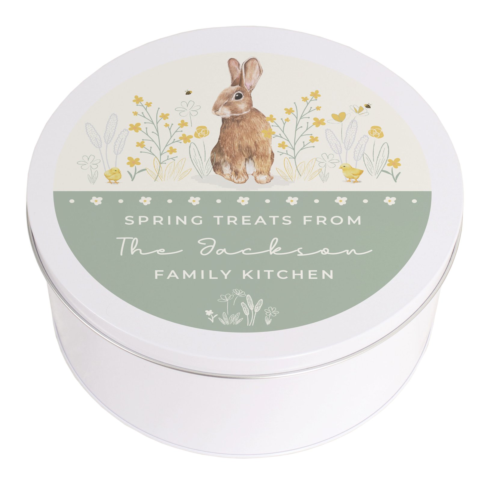 Keep your homemade delights fresh and beautifully stored with our Personalised Spring Bunny Round Cake Tin. Adorned with a sweet bunny and floral design, this tin is the perfect blend of practicality and seasonal charm – ideal for cakes, biscuits, and all your Easter goodies.