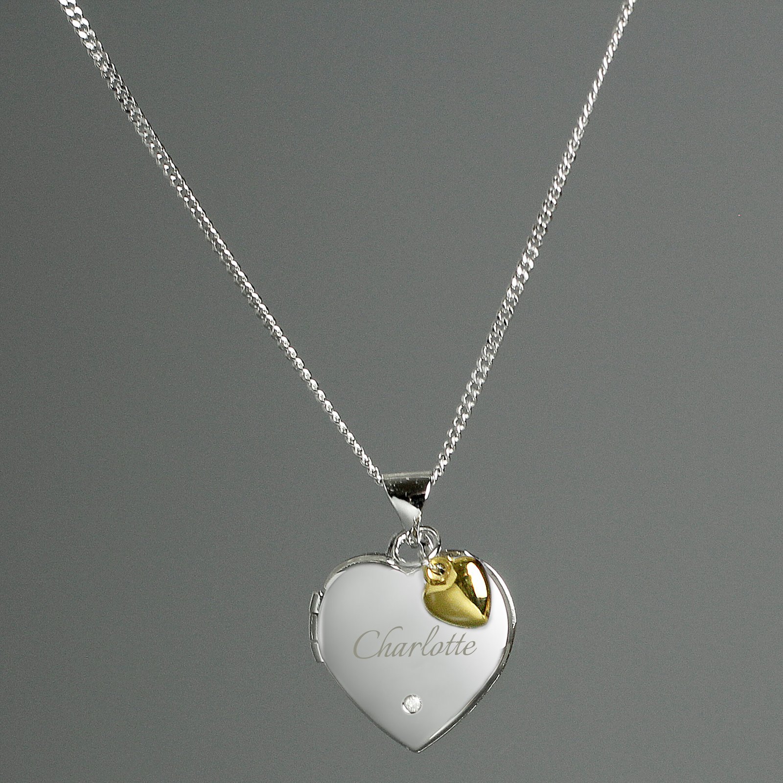 Personalised Sterling Silver Heart Locket Necklace with Diamond & 9ct Gold Charm
