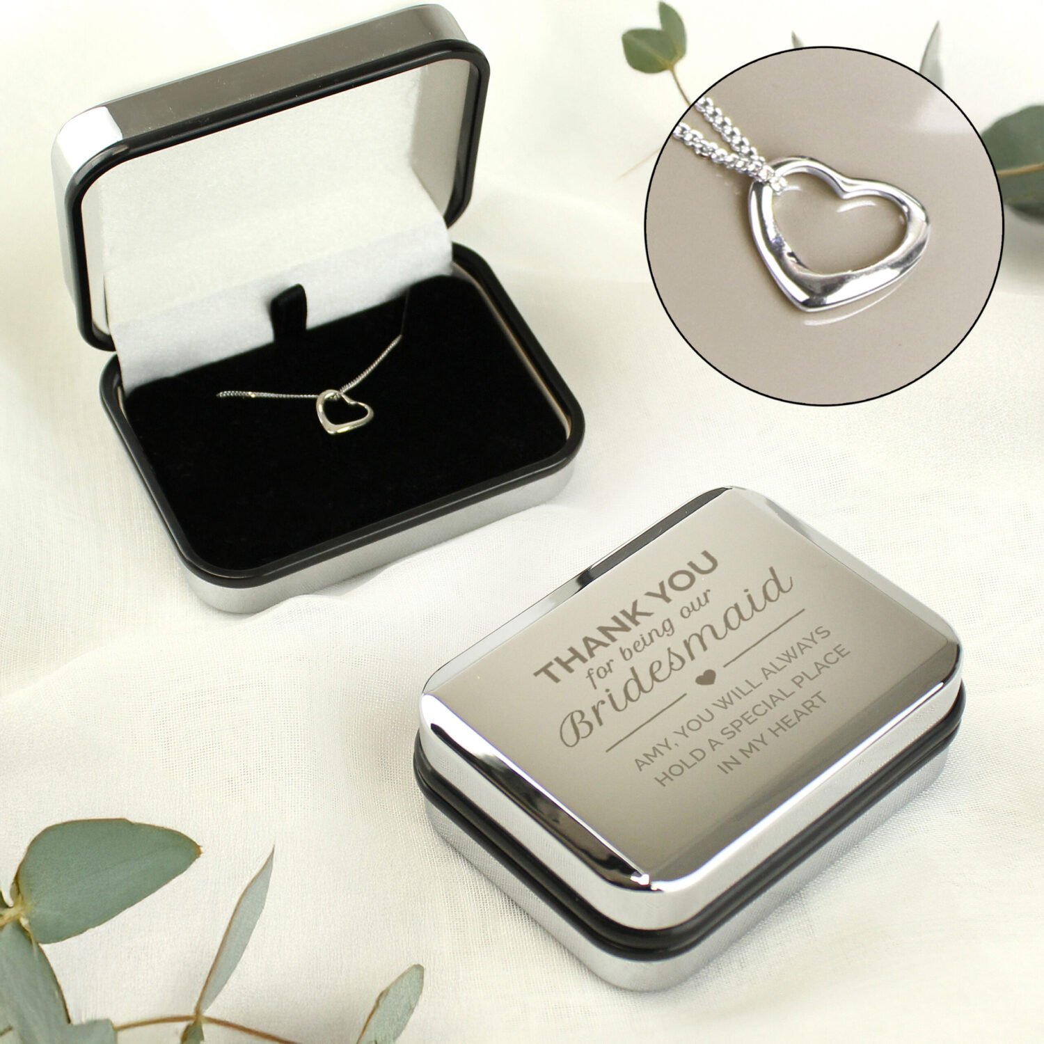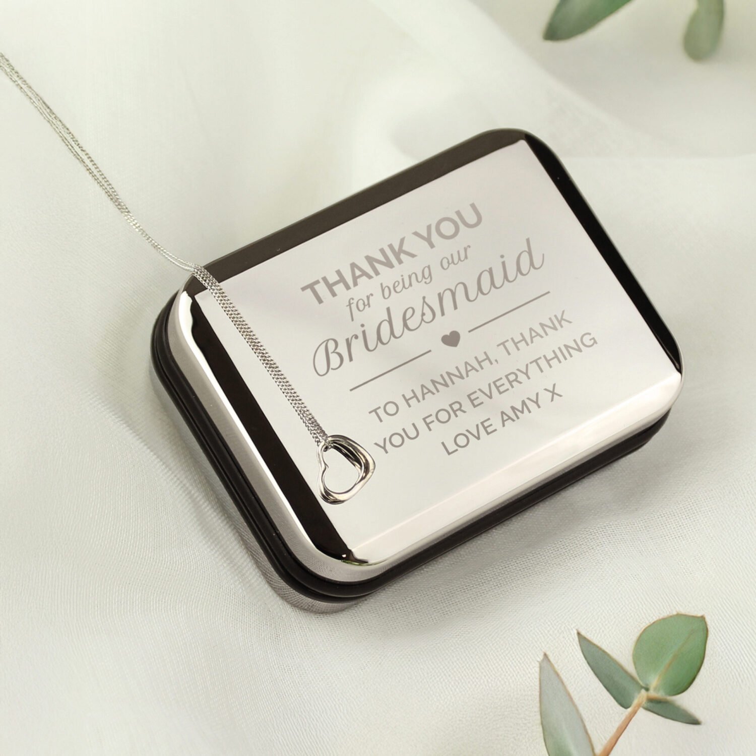Personalised Sterling Silver Heart Necklace & Chrome Plated ‘Bridesmaid’ Gift Box