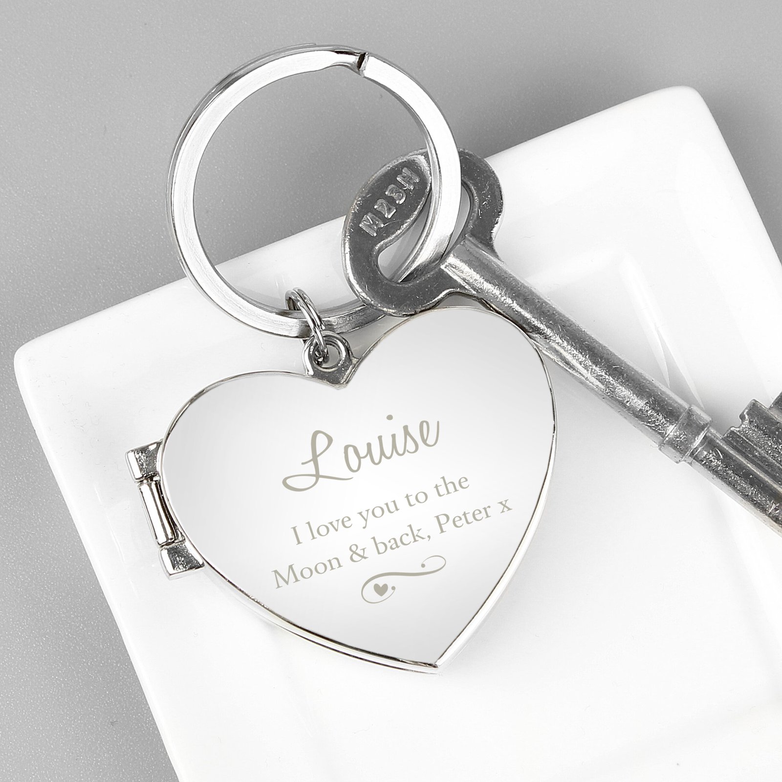 Keep treasured memories close with this beautiful Personalised Swirl Heart Motif Photo Frame Keyring. With space for two cherished photos and a heartfelt message, it’s the perfect gift for someone special.