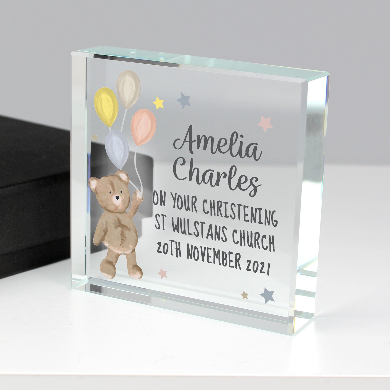 Celebrate the arrival of a little one with this charming Personalised Teddy & Balloons Crystal Glass Token. Featuring a sweet teddy and balloon motif, this elegant keepsake makes a thoughtful gift for a new baby, young child, or christening, and is perfect for display in any nursery.