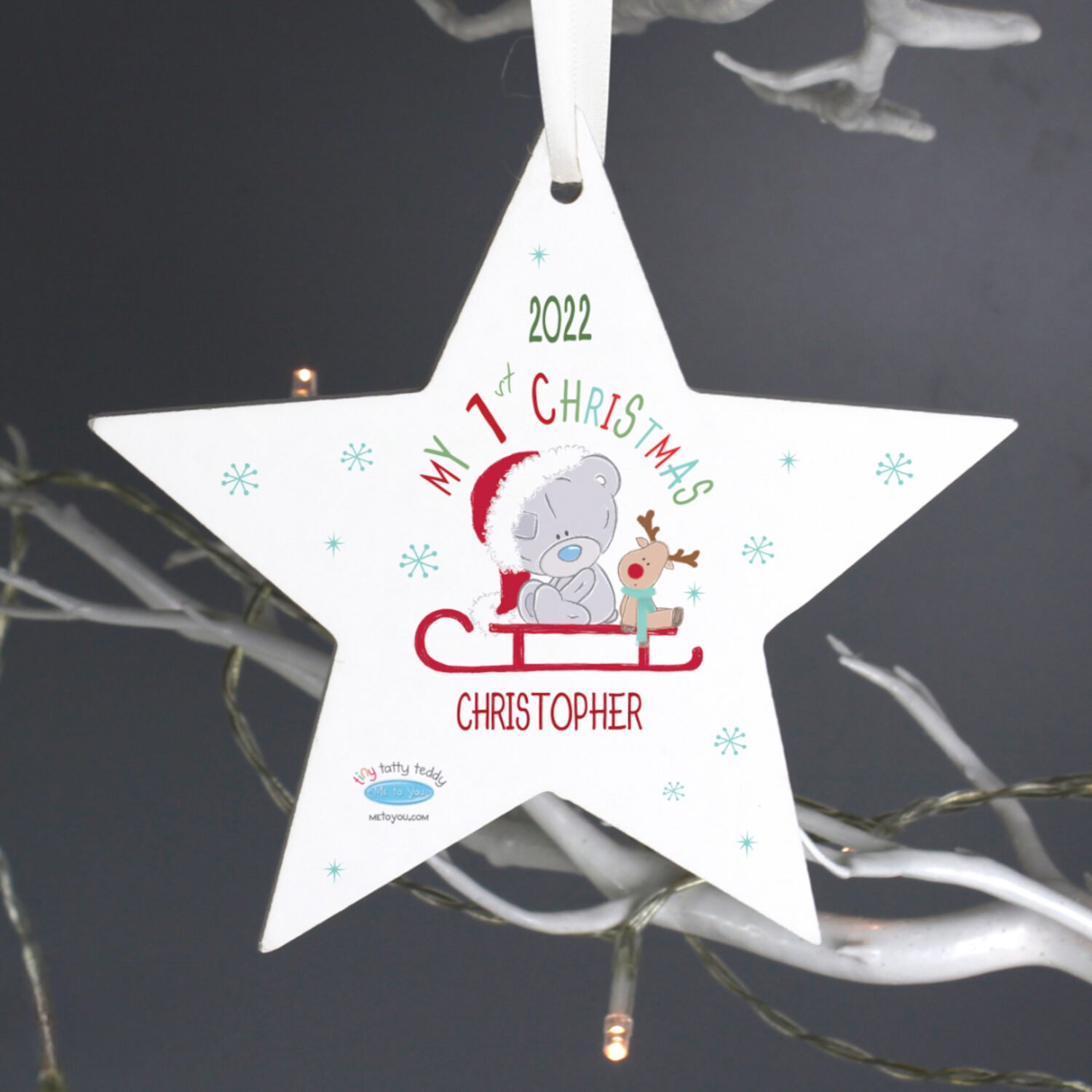 Personalised Tiny Tatty Teddy Sleigh ‘My 1st Christmas’ Wooden Star Decoration