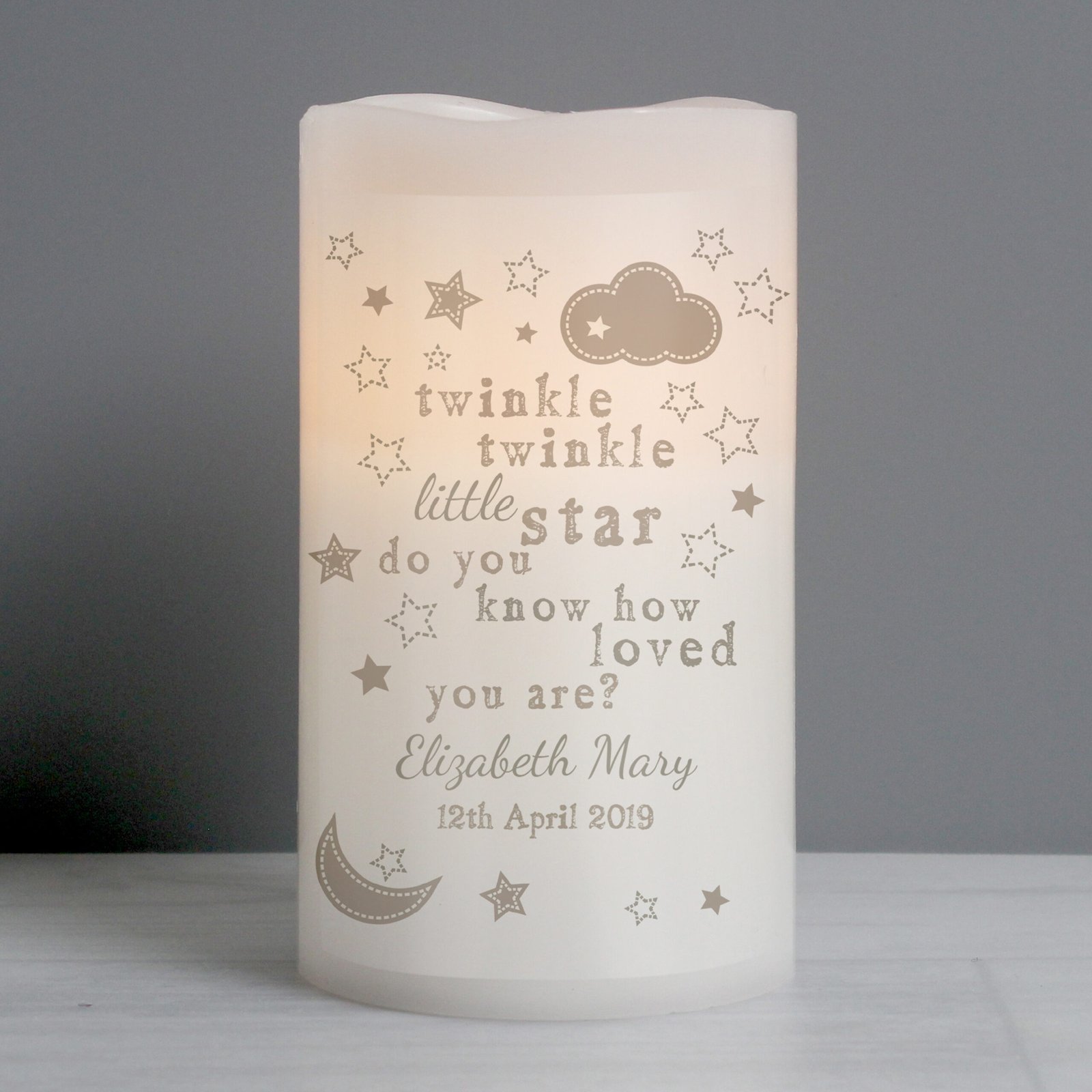 Create a warm and soothing atmosphere in any nursery or bedroom with this Personalised ‘Twinkle Twinkle Little Star’ LED Night Light Candle. Featuring the touching fixed message “twinkle twinkle little star, do you know how loved you are?”, this beautifully soft-glow LED candle is the perfect keepsake gift for a little one.