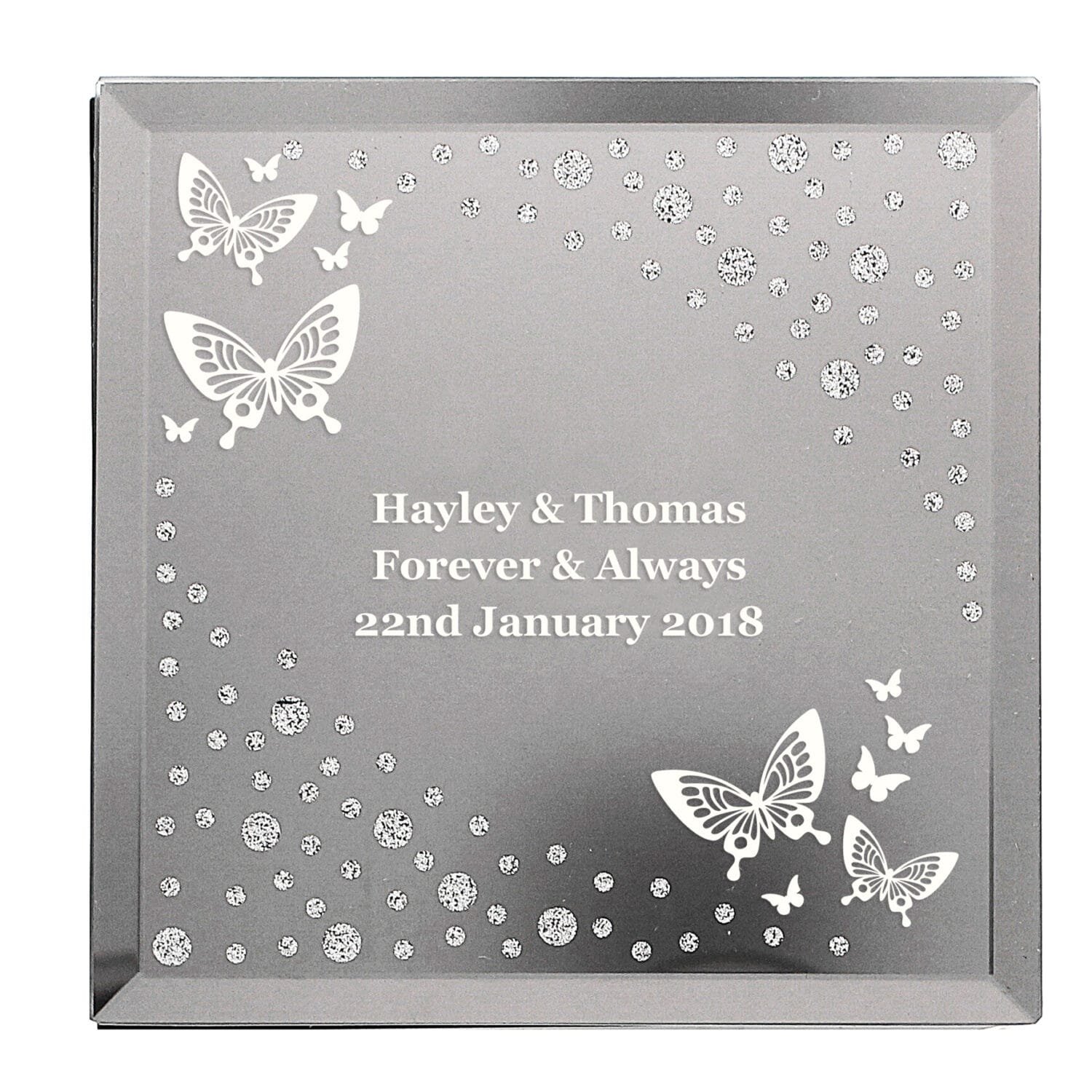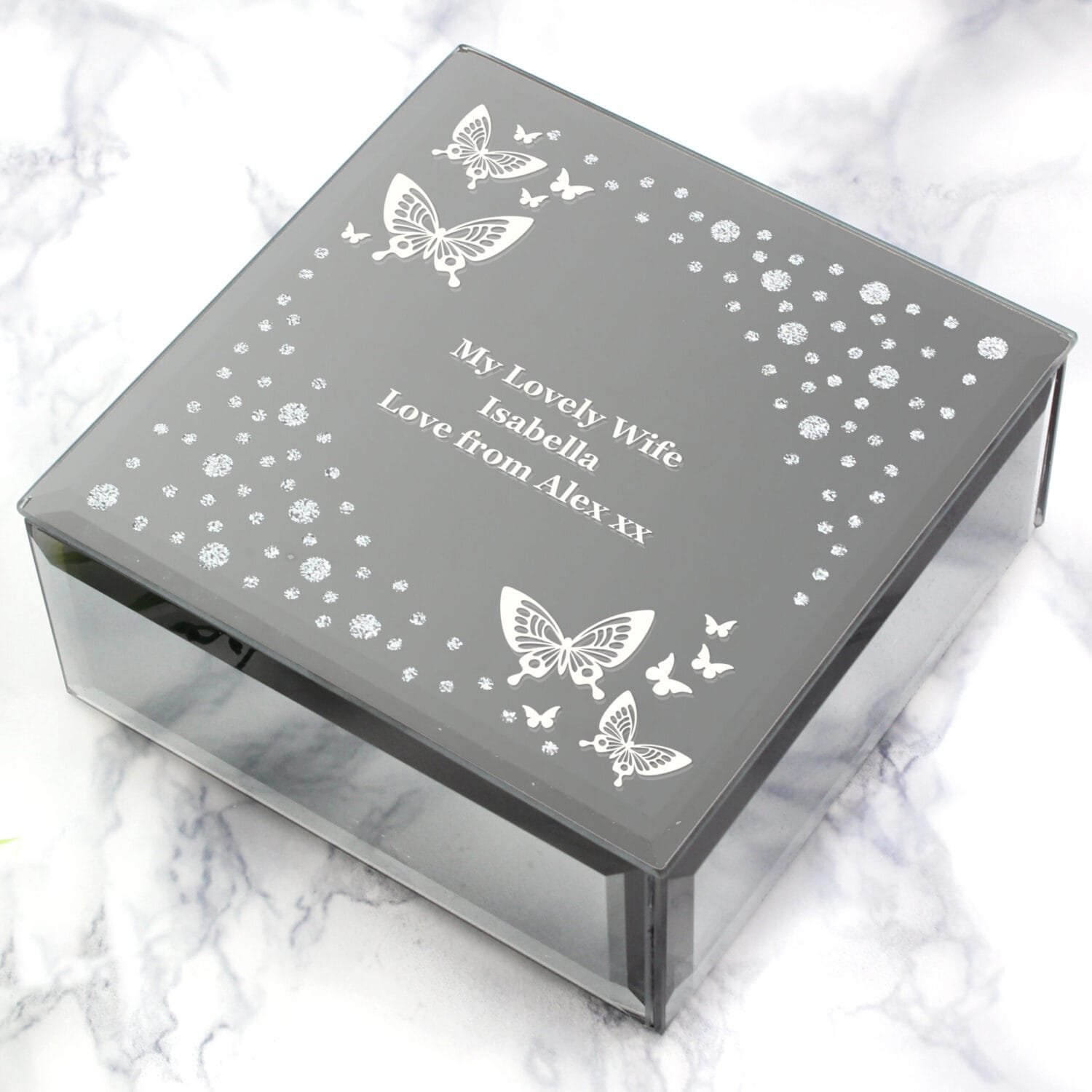 Elegant and refined, our Personalised White Butterfly Diamante Glass Trinket Box is a beautiful way to store jewellery, keepsakes, and sentimental treasures. Featuring a delicate white butterfly design with sparkling diamante detailing, it’s a gift that combines grace and practicality in perfect harmony.