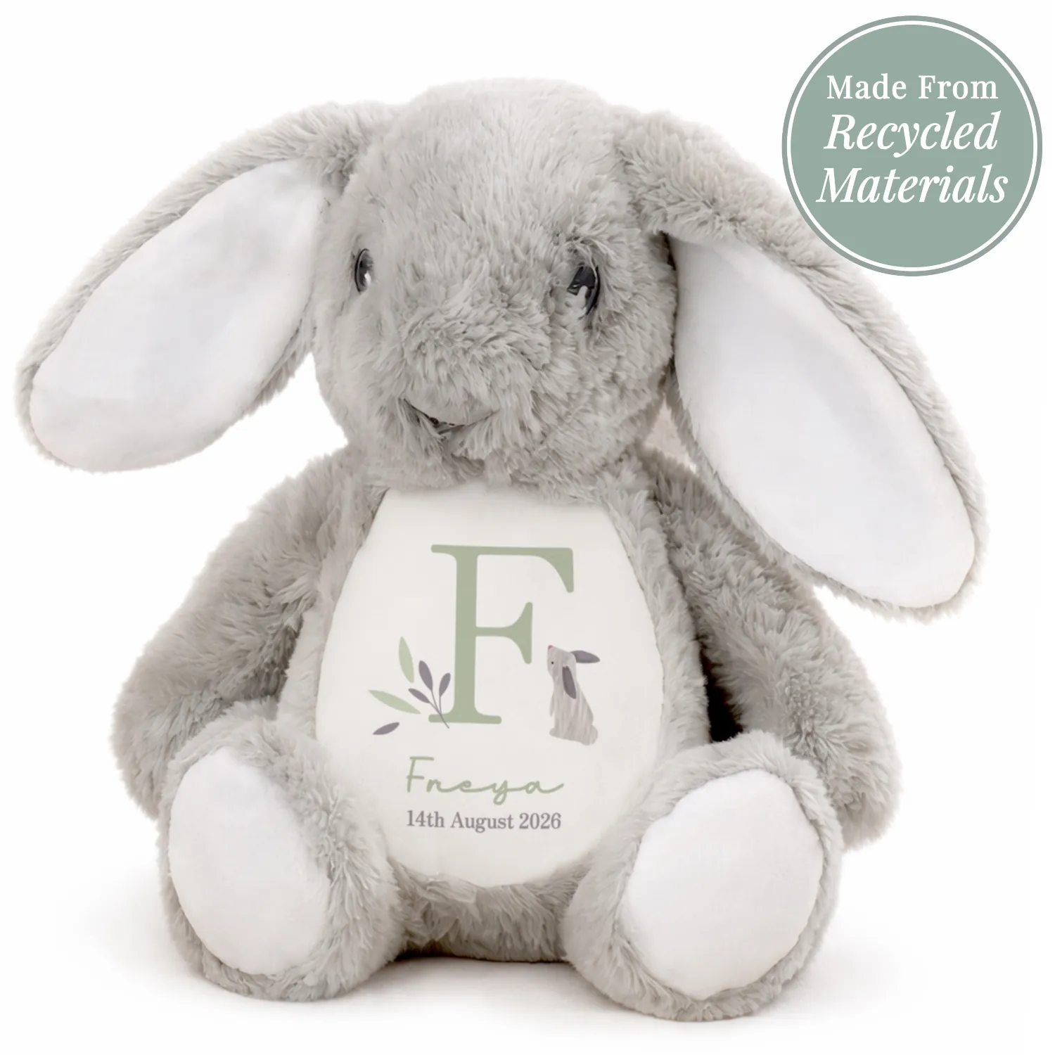 Made from super-soft plush fabric, the bunny is designed to sit neatly on the edge of a shelf, bed, or nursery display, making it both a comforting toy and a delightful decorative keepsake. Whether given to celebrate a new arrival, a birthday, or a special milestone, this personalised bunny is sure to be treasured.