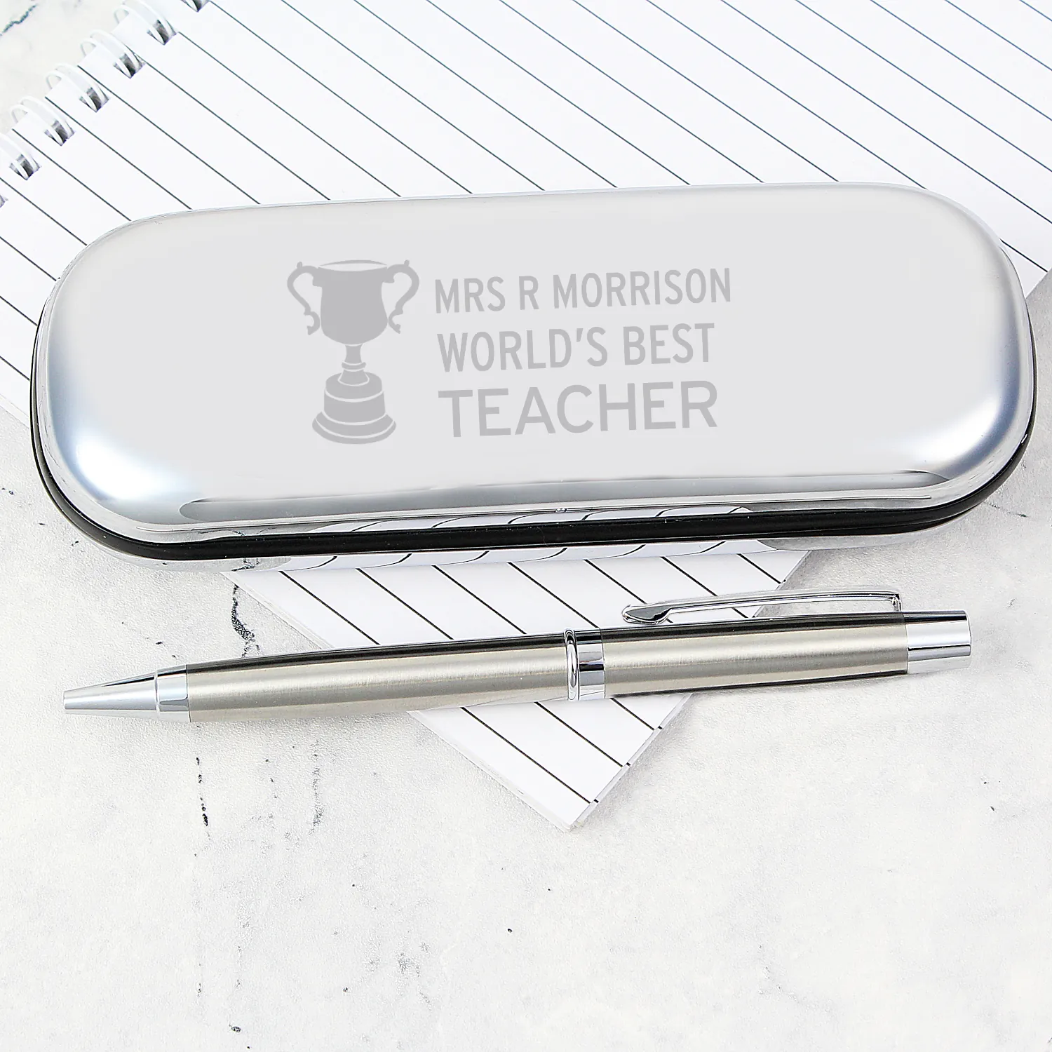 Personalised ‘World’s Best Teacher’ Trophy Motif Chrome Plated Pen & Gift Box Set