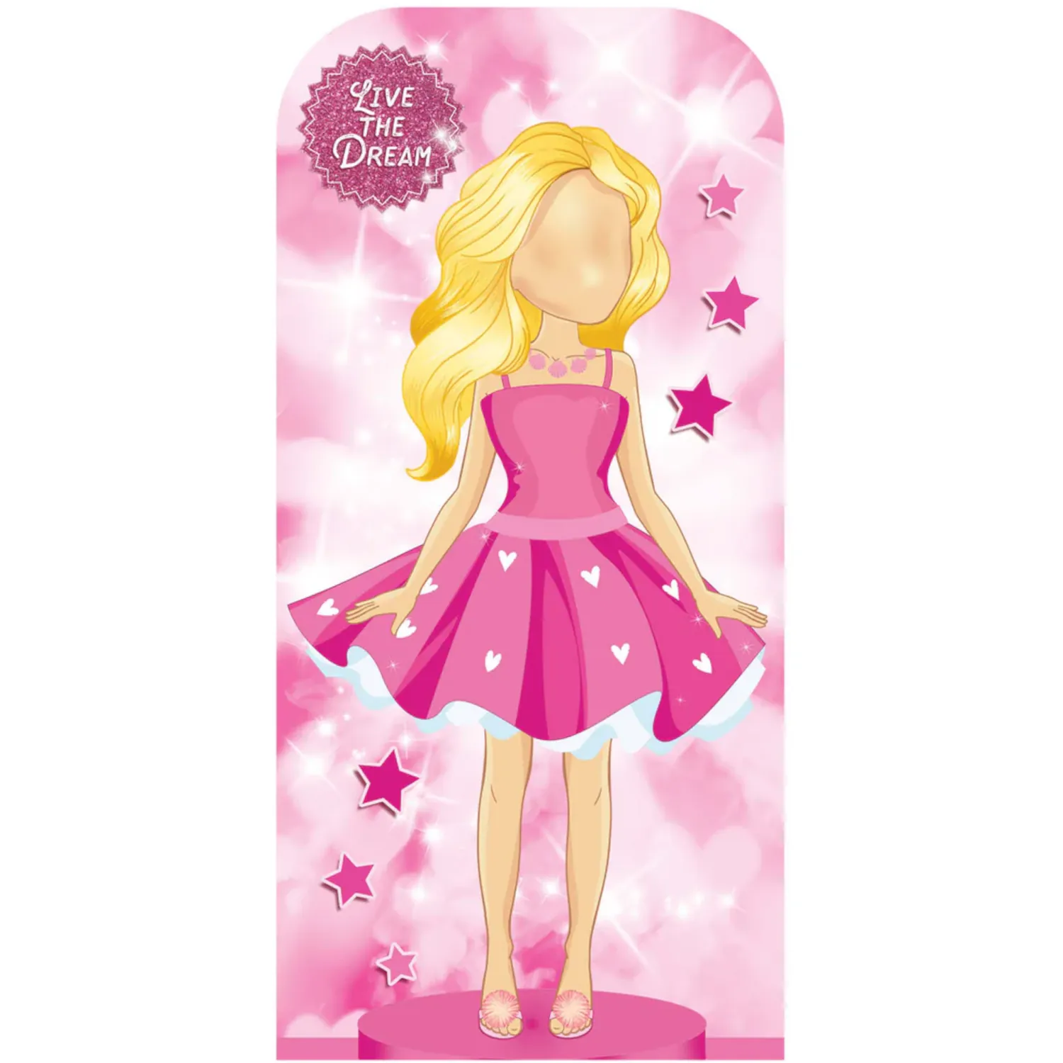 Bring sparkle, creativity, and playful glamour to your event with the Pink Doll Design “Live The Dream” lifesize stand-in cardboard cutout – the perfect way to step into a dream world and become the star of the show!