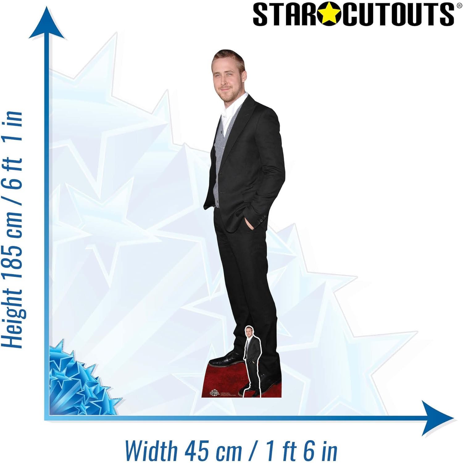 Add Hollywood sophistication to any room or event with this premium Ryan Gosling lifesize and mini cardboard cutout set. Featuring the acclaimed actor in a sharp black suit, this standee brings effortless style, charisma and star quality to displays, parties, photo opportunities and collector setups.