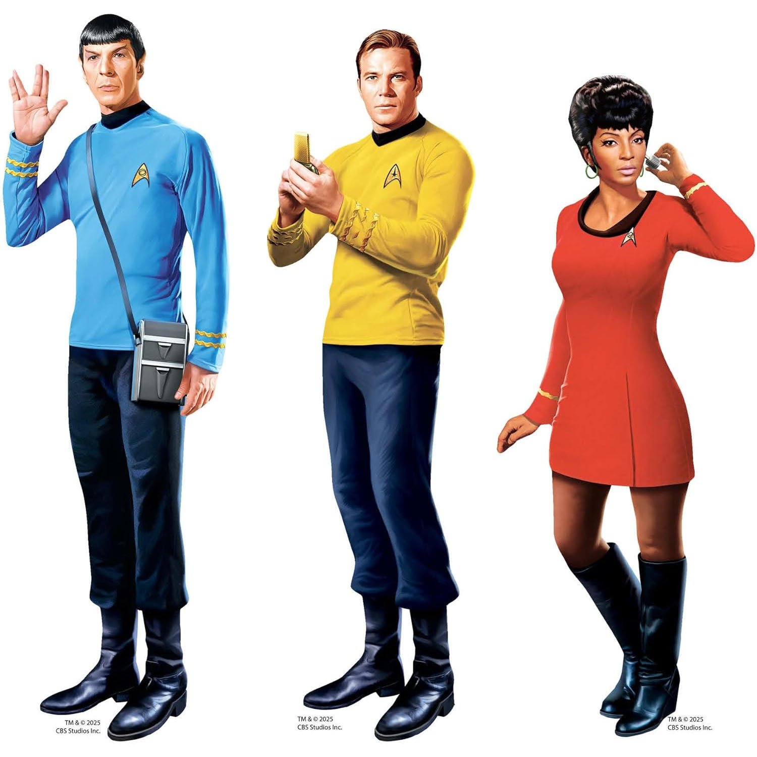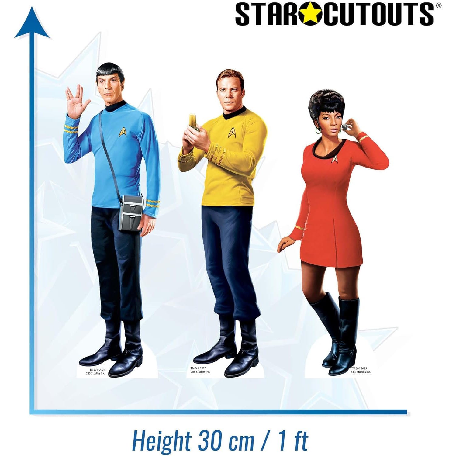 With Spock in his classic blue science officer attire giving the Vulcan salute, Uhura in her striking red dress holding her communicator, and Kirk in his bold yellow captain’s tunic with a phaser, each standee captures the unmistakable look and personality of these legendary characters.