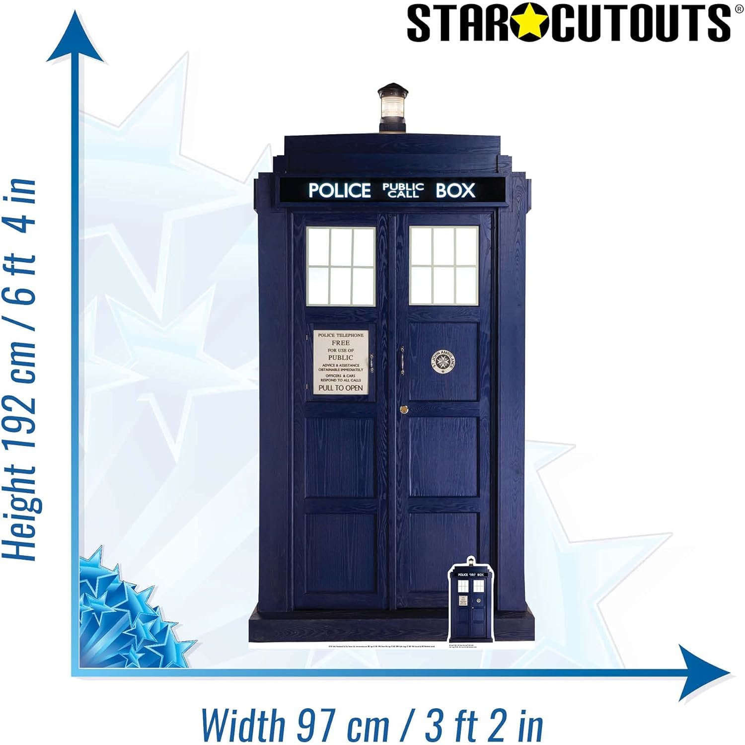 Step into the Whoniverse with this officially licensed TARDIS cardboard cutout set, featuring a two-thirds lifesize version standing at 192 cm and a matching mini cutout. The TARDIS (Time And Relative Dimension In Space) is the Doctor’s iconic time-traveling spaceship, famous for being sentient and “bigger on the inside.” Its classic blue police box exterior, stuck due to a broken chameleon circuit, hides vast interiors, from libraries to gardens to the central control room.