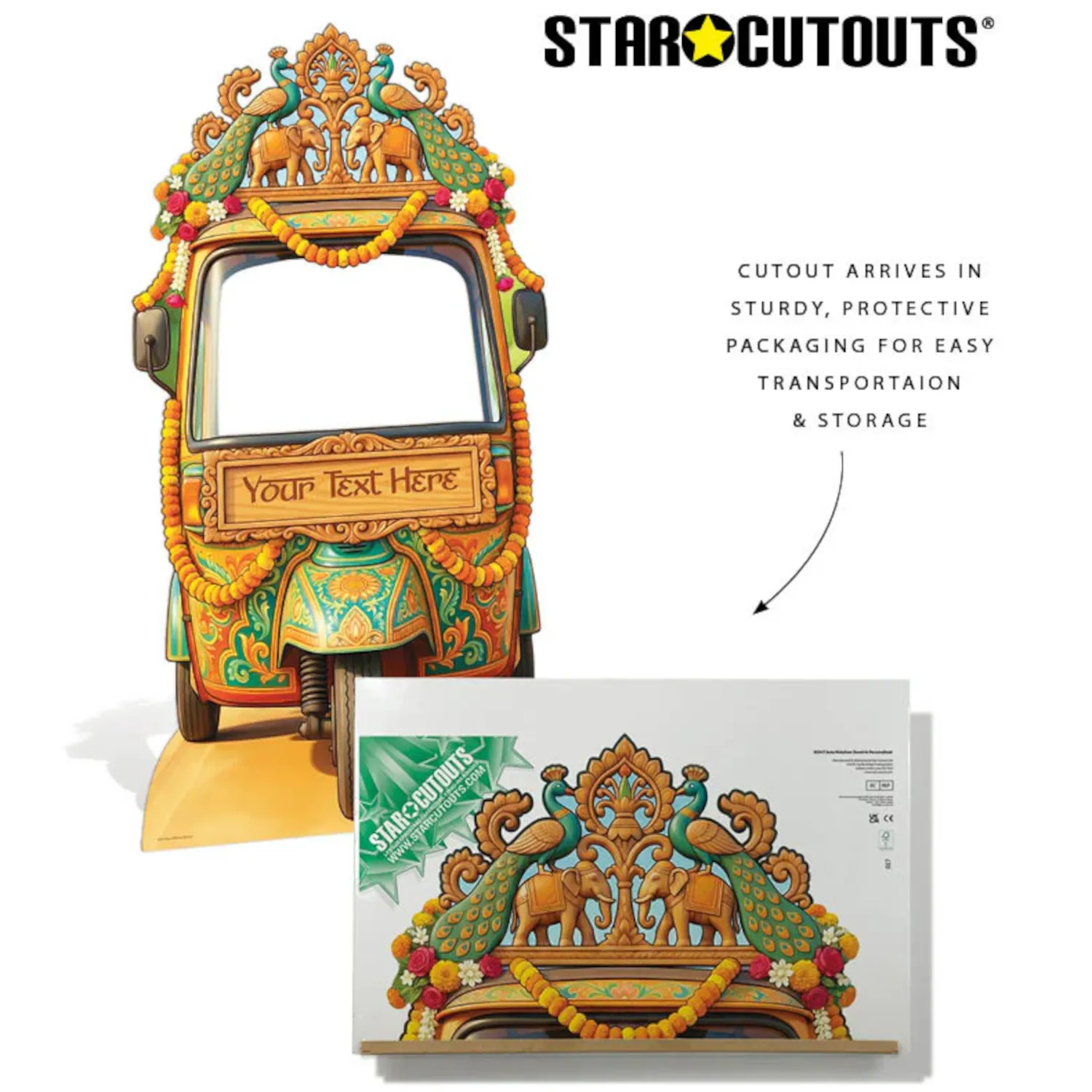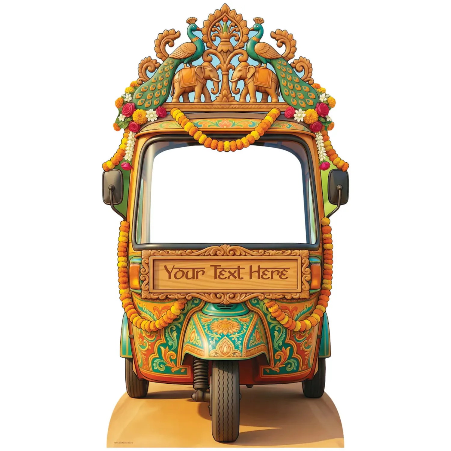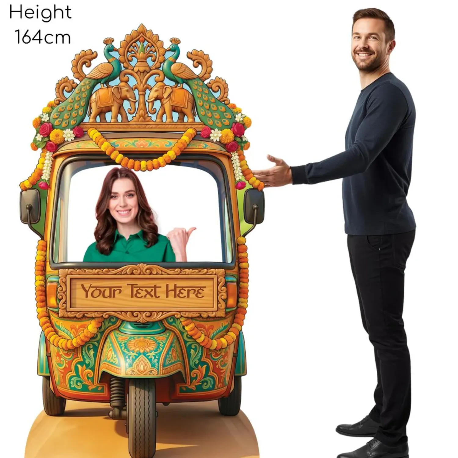 Bring vibrant colour, cultural charm, and interactive fun to your celebration with this Desi-inspired Wedding Tuk Tuk / Auto Rickshaw stand-in backdrop. Standing 164 cm tall and 91 cm wide, it creates an eye-catching photo spot where guests can step straight in and pose — adding instant atmosphere with no complicated setup required.