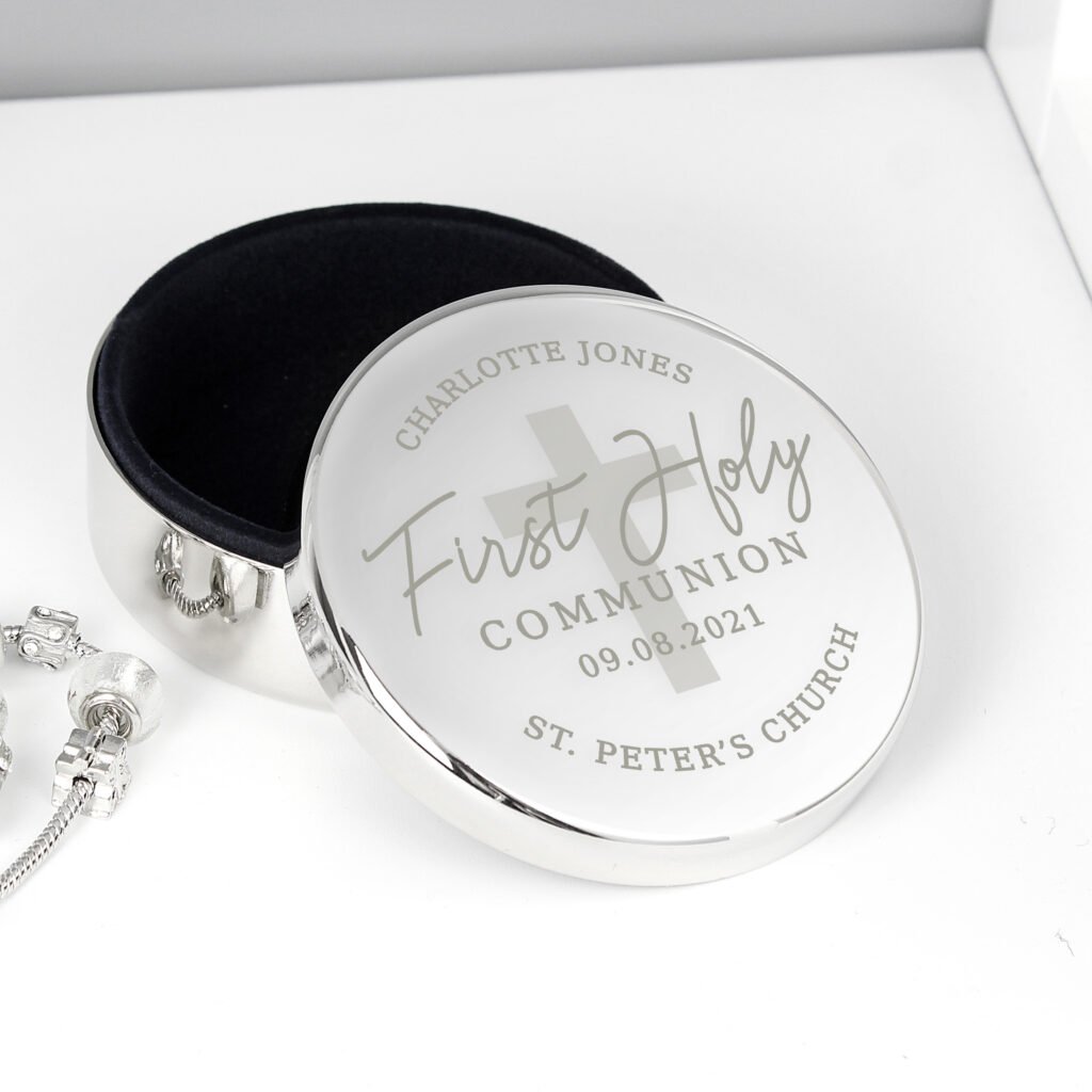 Personalised ‘First Holy Communion’ Silver Nickel Plated Heart Shaped Trinket Box & Rosary Beads Set